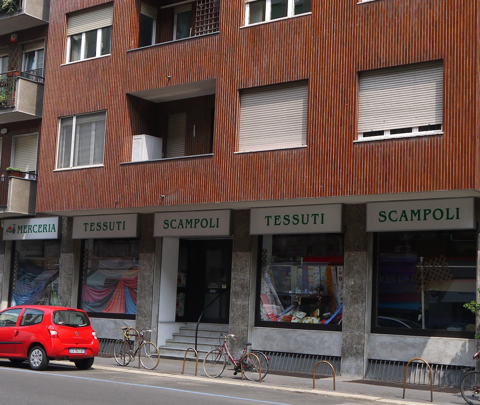 I had googled fabric stores in Milan prior to getting here but came up with zilch. Then one afternoon, sitting in a cafe watching all the beautiful people strolling by, I happened to catch sight of a girl holding a carrybag printed with the unmistakeable motifs of a fabric store; roll of fabric, scissors, measure rule. Could barely contain my excitement. Fortunately could make out the name of the store, and immediately looked it up and headed out there… pronto
