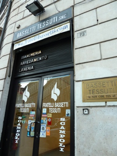 First stop, Rome; and before we had headed off on our trip I had read about Fratelli Bassetti Tessuti in a really excellent review which is also on the store website, and from which I also borrowed the below photo of the store exterior since I neglected to take my own.
