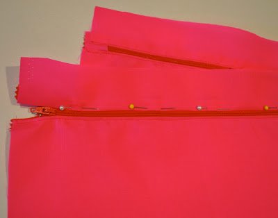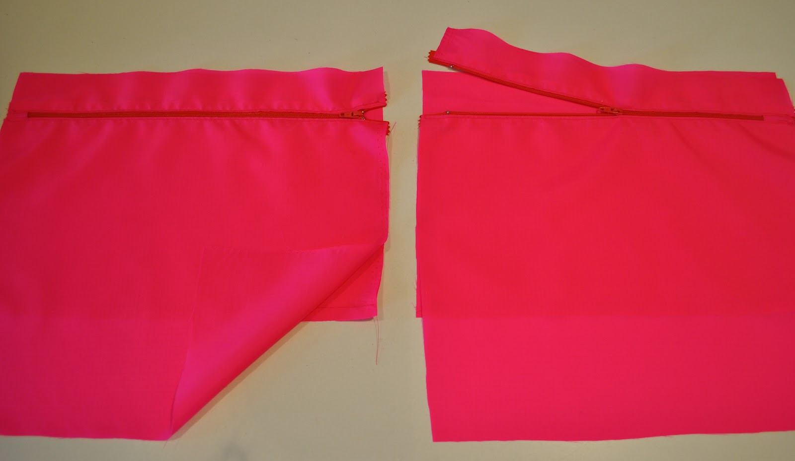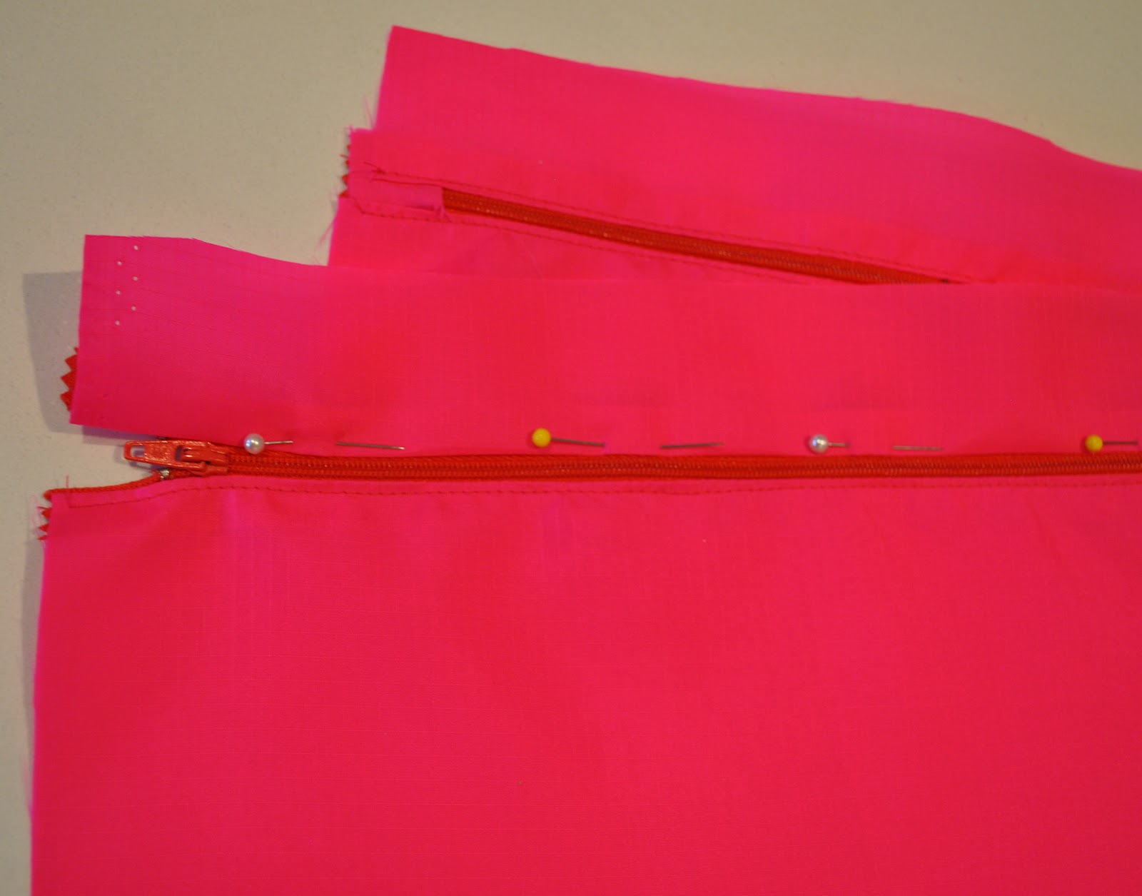 Now cut a full width piece to form the back lining of the pocket… these should be long enough to extend from the “top edge of the pocket lining” mark to the “lower edge of the pocket lining” mark. Stitch the upper edge of this to the upper edge of the piece on the zip, and the lower edge to the lower shorter edge behind that long front piece, as pictured below…
