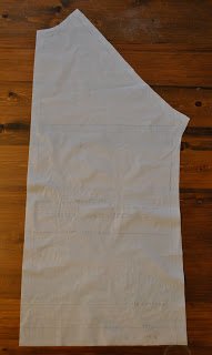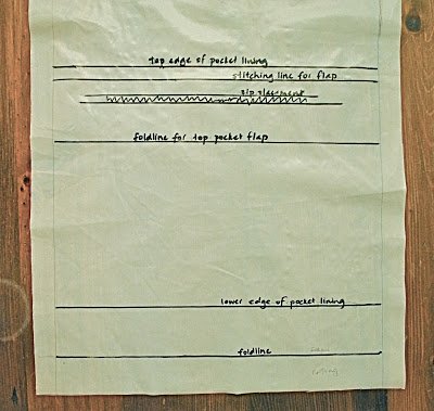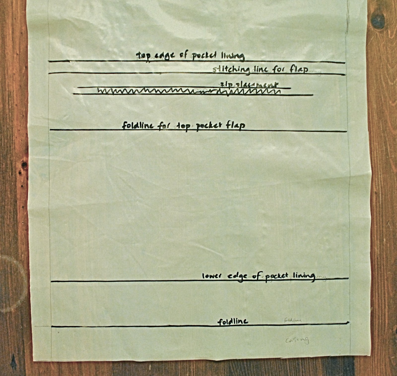 The front jacket piece looks like above, and the close-up below shows the relevant markings for the front pockets. I’ve re-marked them but I apologise that it is still difficult to read them; they read, from the top: