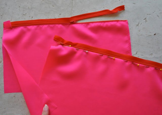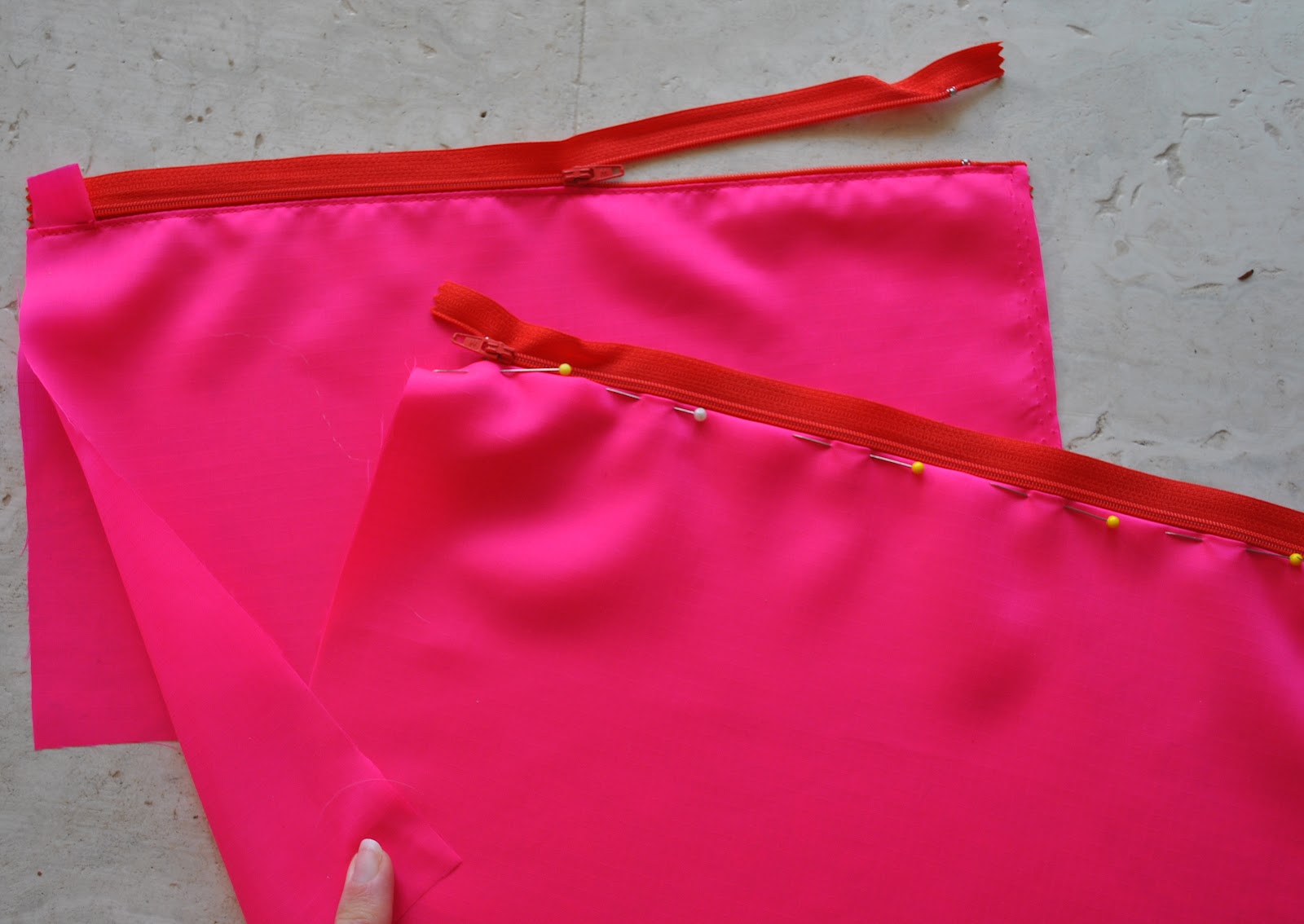 Press the fold in place. Pin and topstitch in place the two zips at the pressed foldline, remembering to place them to open at opposite ends to each other. At the upper left edge of the top pocket piece can be seen a small piece of folded fabric, stitched inside the seam to cover the metal zip stop and the bottom of the zip… even though you won’t be able to see this in the final pocket I still like to have this covered like so…