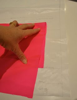 First, cut the two lower front pieces… these should be long enough to extend from the lower edge of the pattern piece above; up to the lower edge of the “zip placement”, and then fold here to finish at the “lower edge of the pocket lining”. I’ve pictured it splayed out here to show the length and how it folds at the zip placement line…