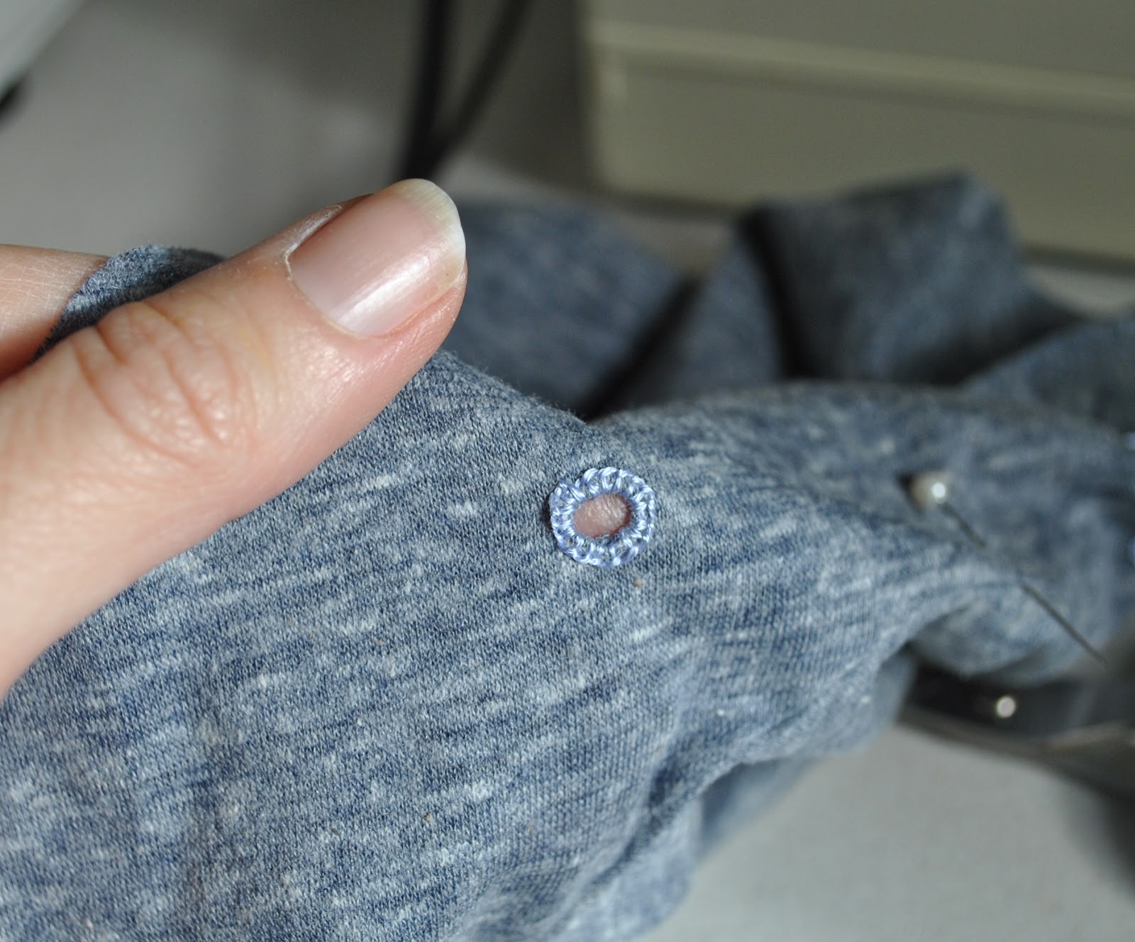 Back where you started, commence embroidering tight blanket stitches, situated hard up against each other, around the hole. When completed, run the thread around underneath the stitching at the back to finish off.