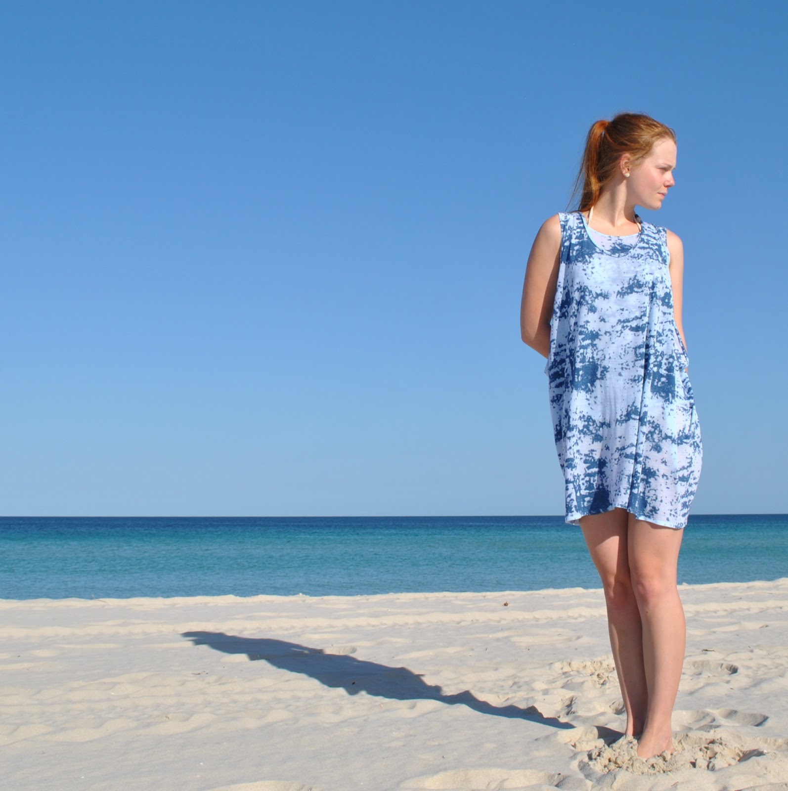 Gorgeous dress – great fabric choice and Cassie looks very cool in that colour. What a fantastic idea to make a tank top in the same fabric – I love it!!!! Your pictures are very tempting – feel like jumping right into that water.