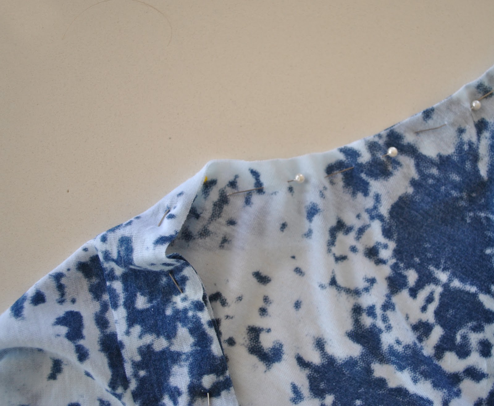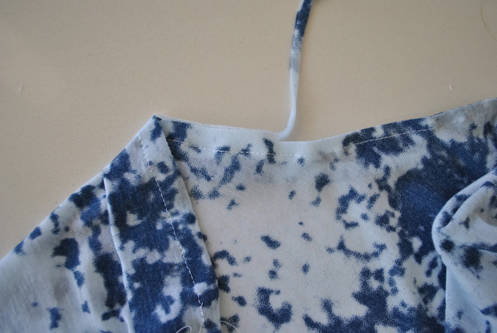 Stitch together the short sides of the strip right sides together, in a 1cm seam. Then pin the right side of the strip to the wrong side of the garment. Your strip is now a bit more than 10% shorter than the armhole/neckline; apply the most stretch when attaching it to the most curved sections of the garment edge, such as the sharpest points of the underarm curve, and the centre front of the neckline.