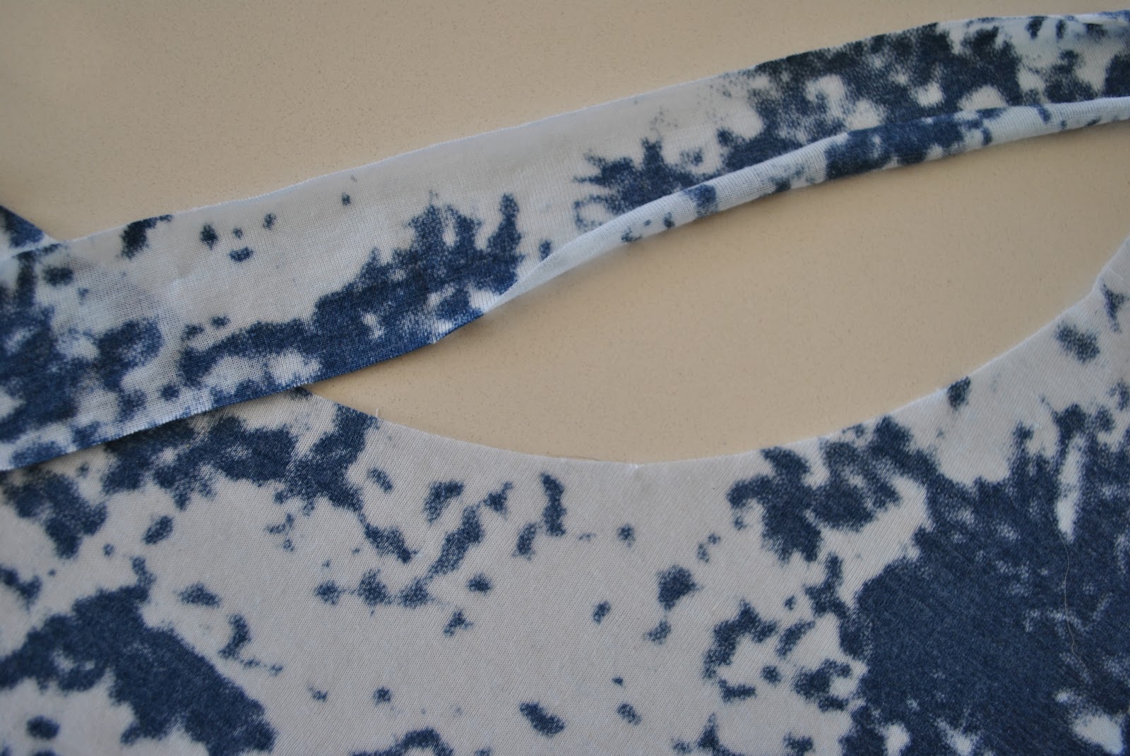 Stitch together the short sides of the strip right sides together, in a 1cm seam. Then pin the right side of the strip to the wrong side of the garment. Your strip is now a bit more than 10% shorter than the armhole/neckline; apply the most stretch when attaching it to the most curved sections of the garment edge, such as the sharpest points of the underarm curve, and the centre front of the neckline.