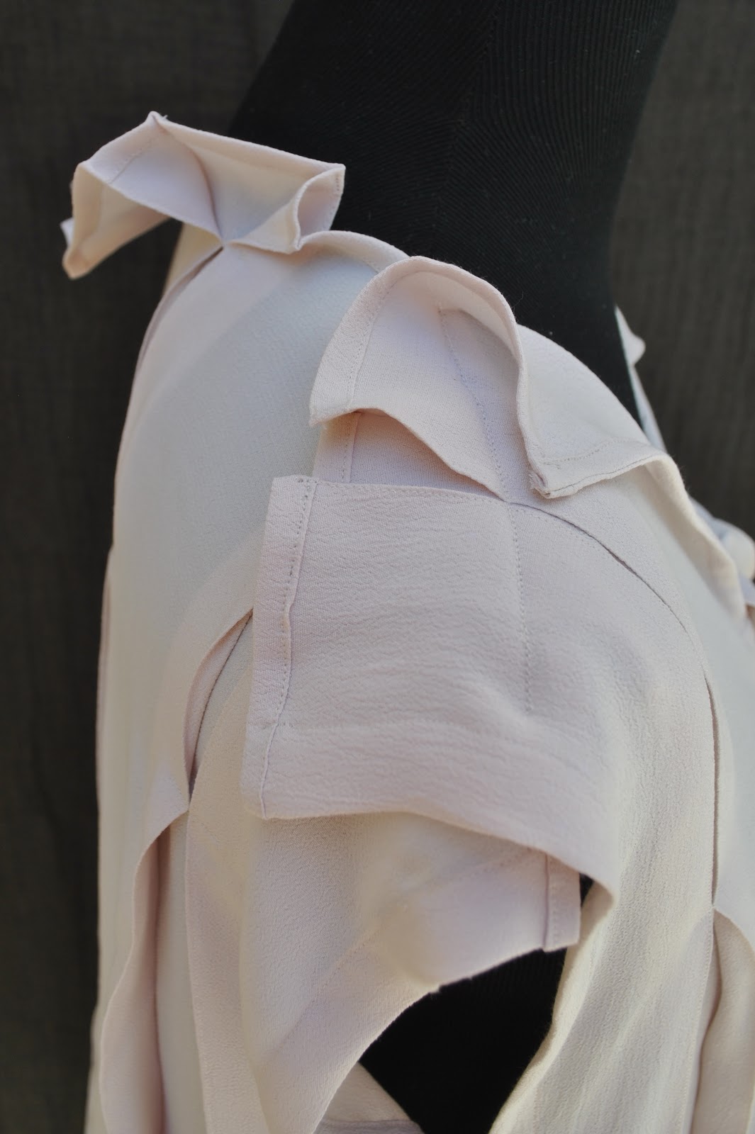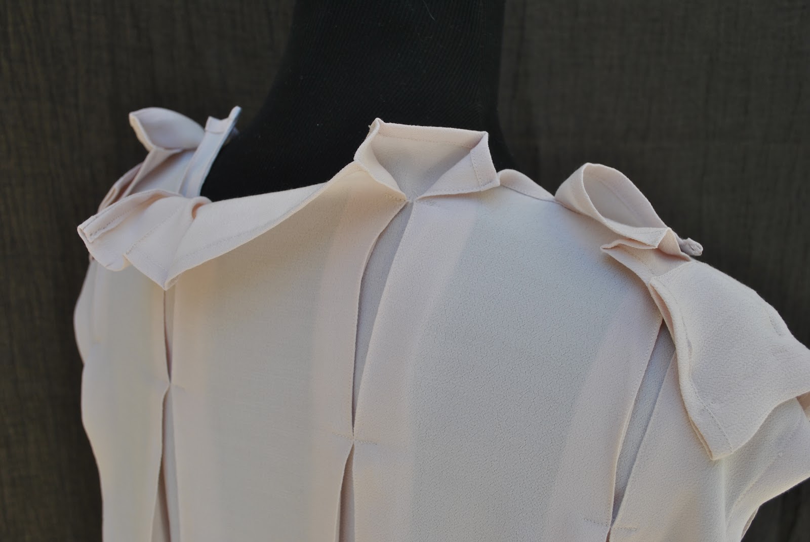 As in for my first version; I edge-stitched each pleat in place. The 100% viscose crepe is quite crisp and stiff compared to the thin silk I used previously; and it presses and pleats like a dream. I think those sharp regular pleats look absolutely wonderful in this more crisp fabric. I’ve taken lots of photos of those pleats and that artfully and prettily crinkled neckline because whilst I do love the slight floppiness of my own top I really really love how crisp, sharp and sculptural the pleats look in this fabric. It looks quite formal and business appropriate.