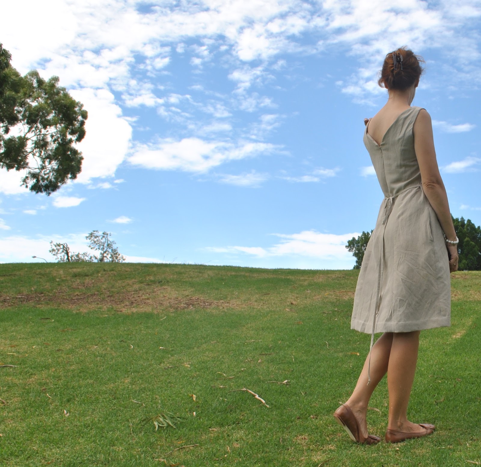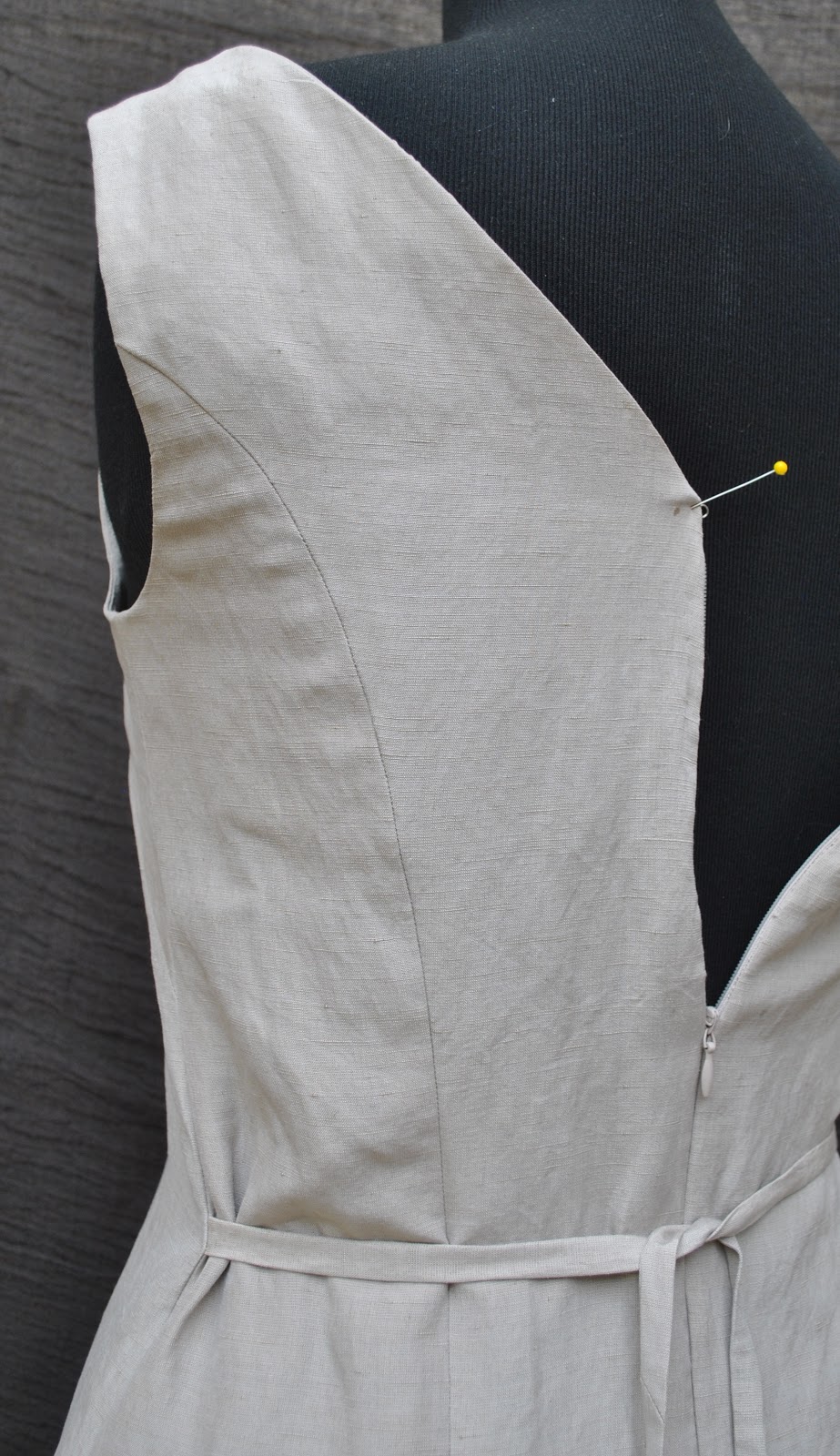 The back is four pieces; interestingly in a princess seamed arrangement.  The dress closure is by invisible zip in the centre back seam, and the back neckline is a modest V-line.  I added deep, inseam side pockets, and attached a self skinny belt in the side seams to tie at the back.  This adds a bit of shape to it, and provides some visual interest at the back, which is otherwise rather plain.  The ends of the belt are tied in little knots, a tiny design echo of those knots at the neckline at the front.