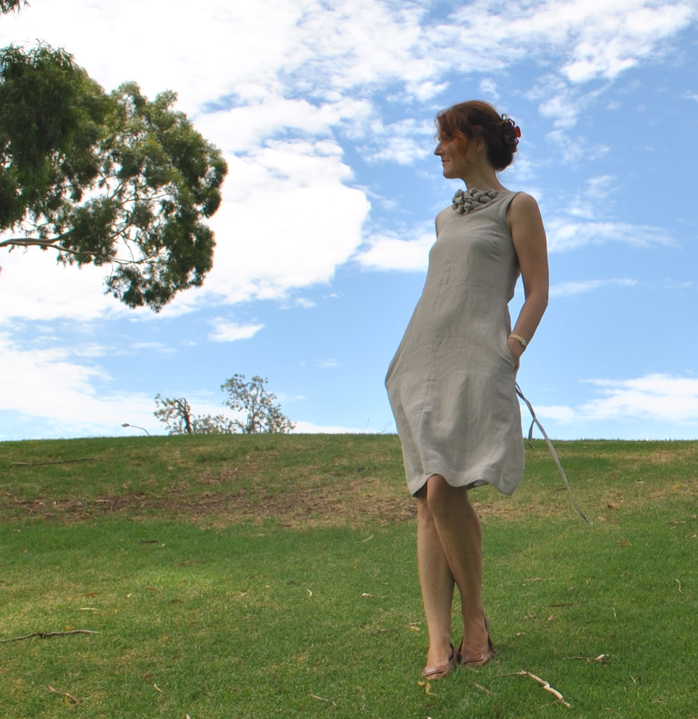 Dress; adapted from the design on p53 of Pattern Magic 2 by Tomoko Nakamichi, light brown silk/linen
