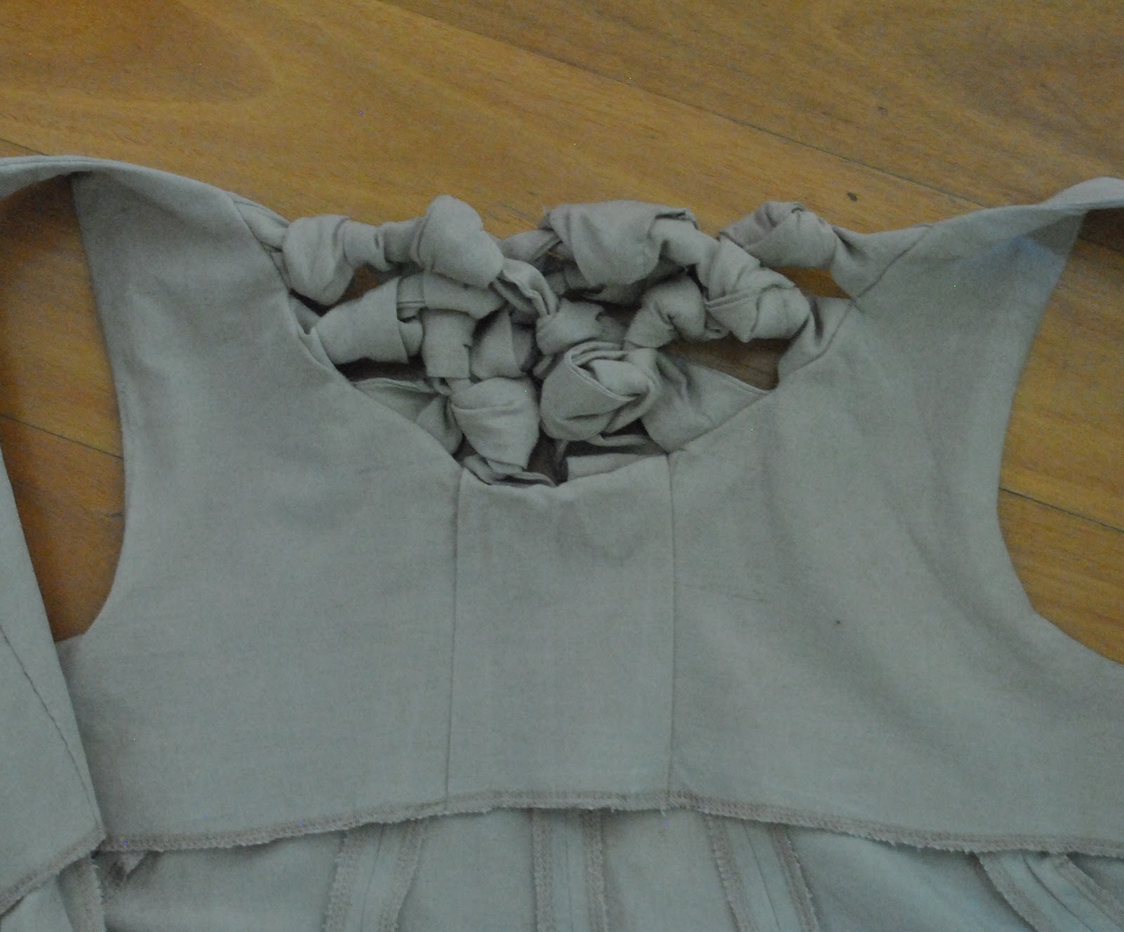 This appears to be a fairly plain dress on a casual glance.  But it is not.  It has a “feature”:  a feature that like many Pattern Magic features, seems to the casual, non-sewing observer to be a superficially simple thing, like “so? what could possibly be difficult about that??” but in actuality, getting to the nitty gritty of it, is a fair dinkum epic saga to put together seamlessly and successfully.  In this case, the feature is that the bodice explodes out into an incorporated posy of entwined knots that looks sorta like a statement neckpiece, or maybe a 3D sculptural bib.  Prof Nakamichi describes it as “By bringing together several knots that resemble tiny bells I have created a unique garment that evokes the sounds of bells ringing”