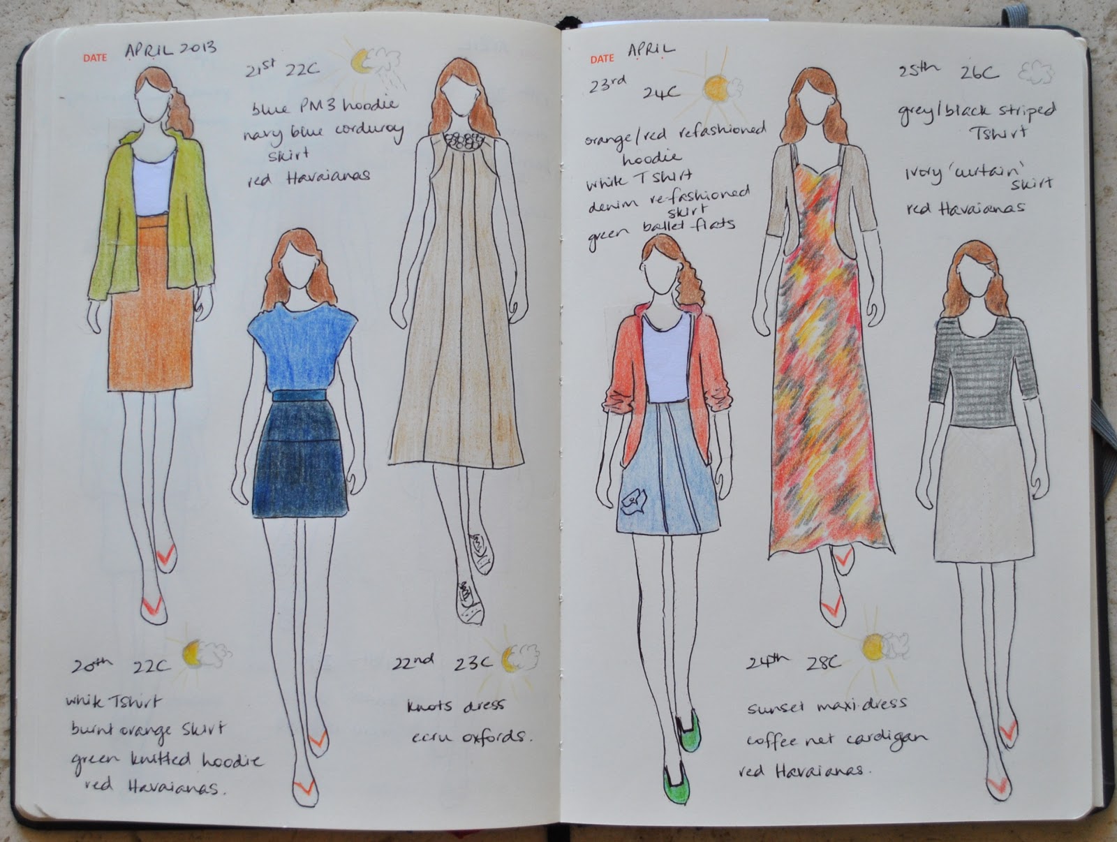 (I’ve pledged to wear only clothes handmade by me this year and to sketch my daily outfits in my Fashionary. I’m calling this the paper doll project)