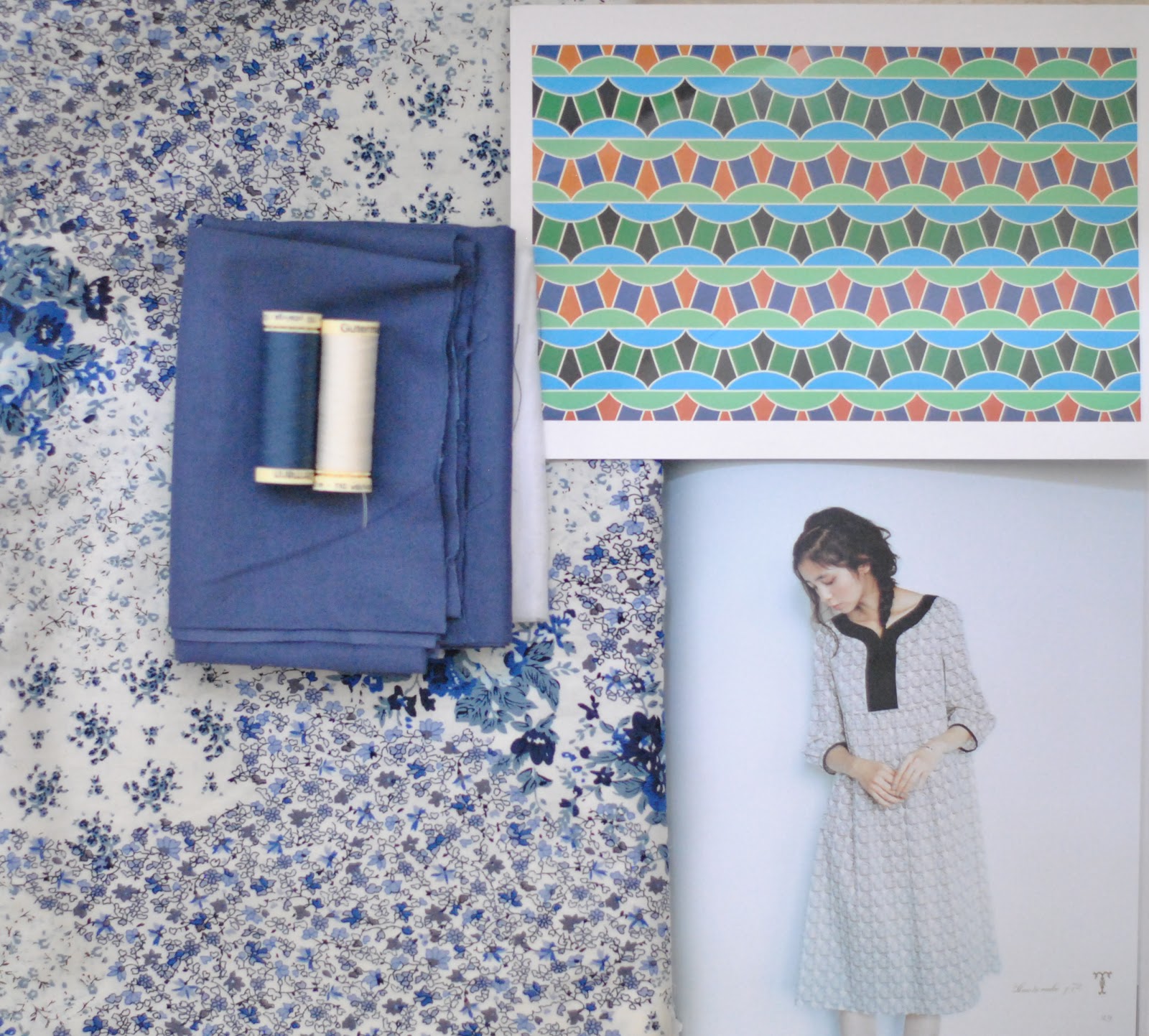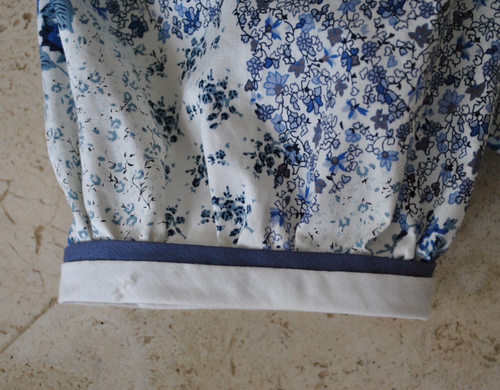 I did make a few teeny minor changes (forgive me, Reana Louise!) I thought a wide block of the blue for a neckband might be a bit strong against the delicacy of the sprigged floral, so I dug out some lightweight Japanese cotton in my stash, originally bought from Potters Textiles. This is pure white, with an irregular pattern of tiny white paisley motifs as well as little fluffy white spots scattered over. I used this for the neckband and for the sleeve cuffs, and just used a narrow, folded bias cut strip of the blue cotton sent by Reana Louise as a demarcation line between the floral and the white.