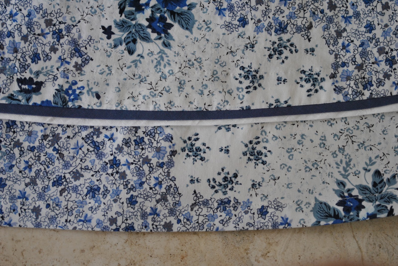 Similarly, I broke apart the hemline with bias cut strips of each white and blue together as well. I really like the look of these borderlines in the design, a subtle geometric statement against the pretty floral.