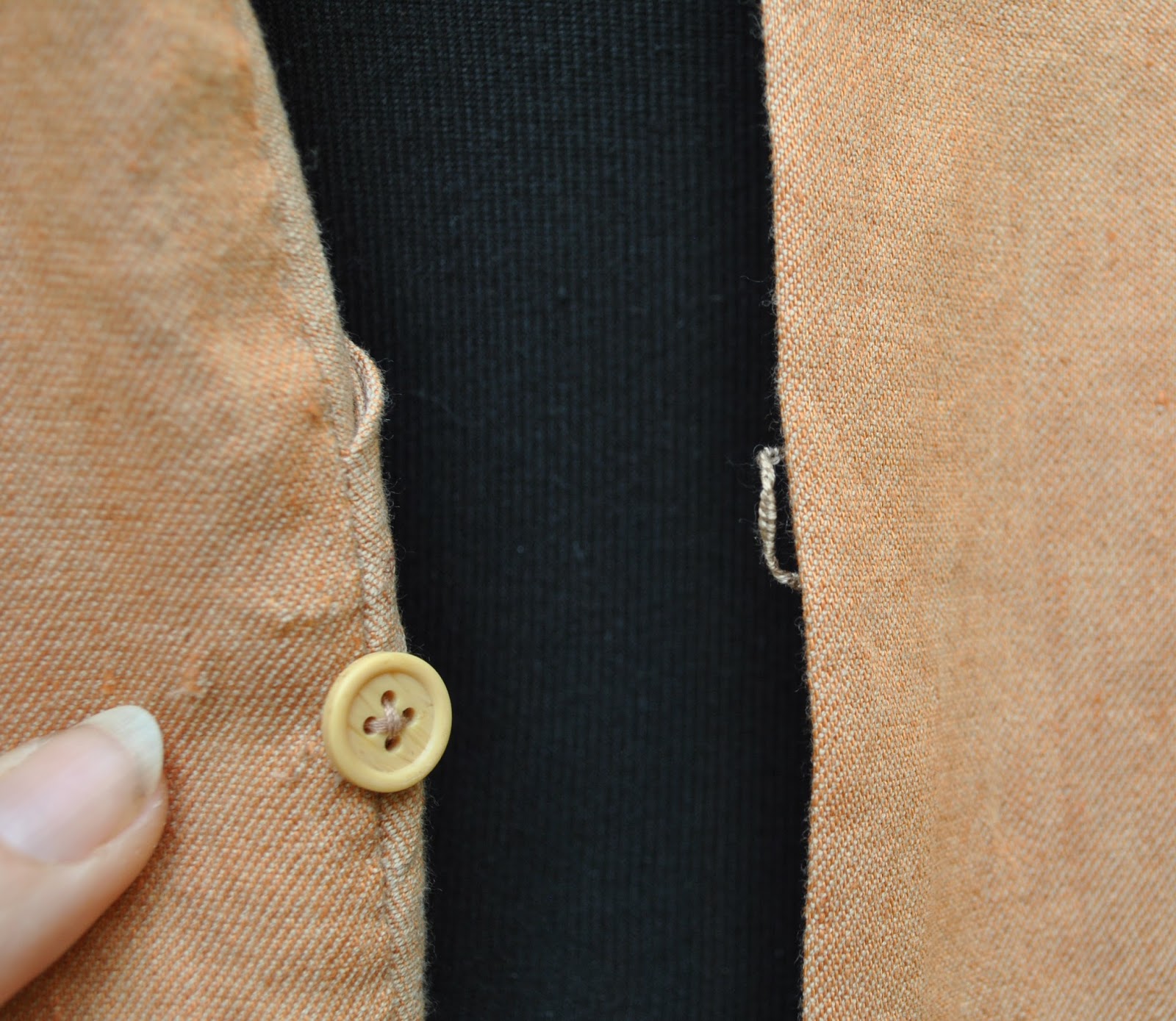 Closure is by a single button and a loop covered with tightly spaced blanket stitching, made from embroidery thread, plus three small brass press-studs.