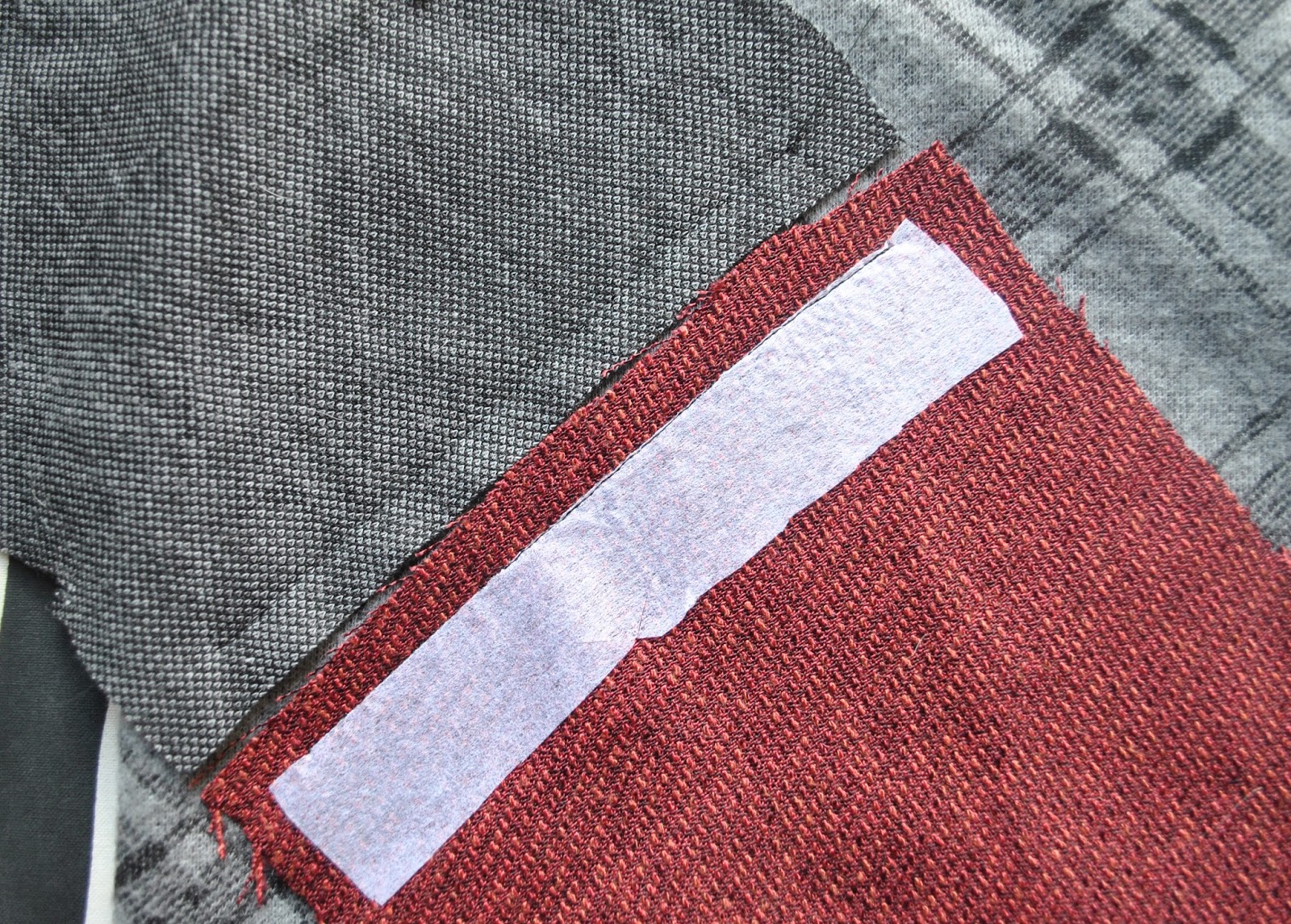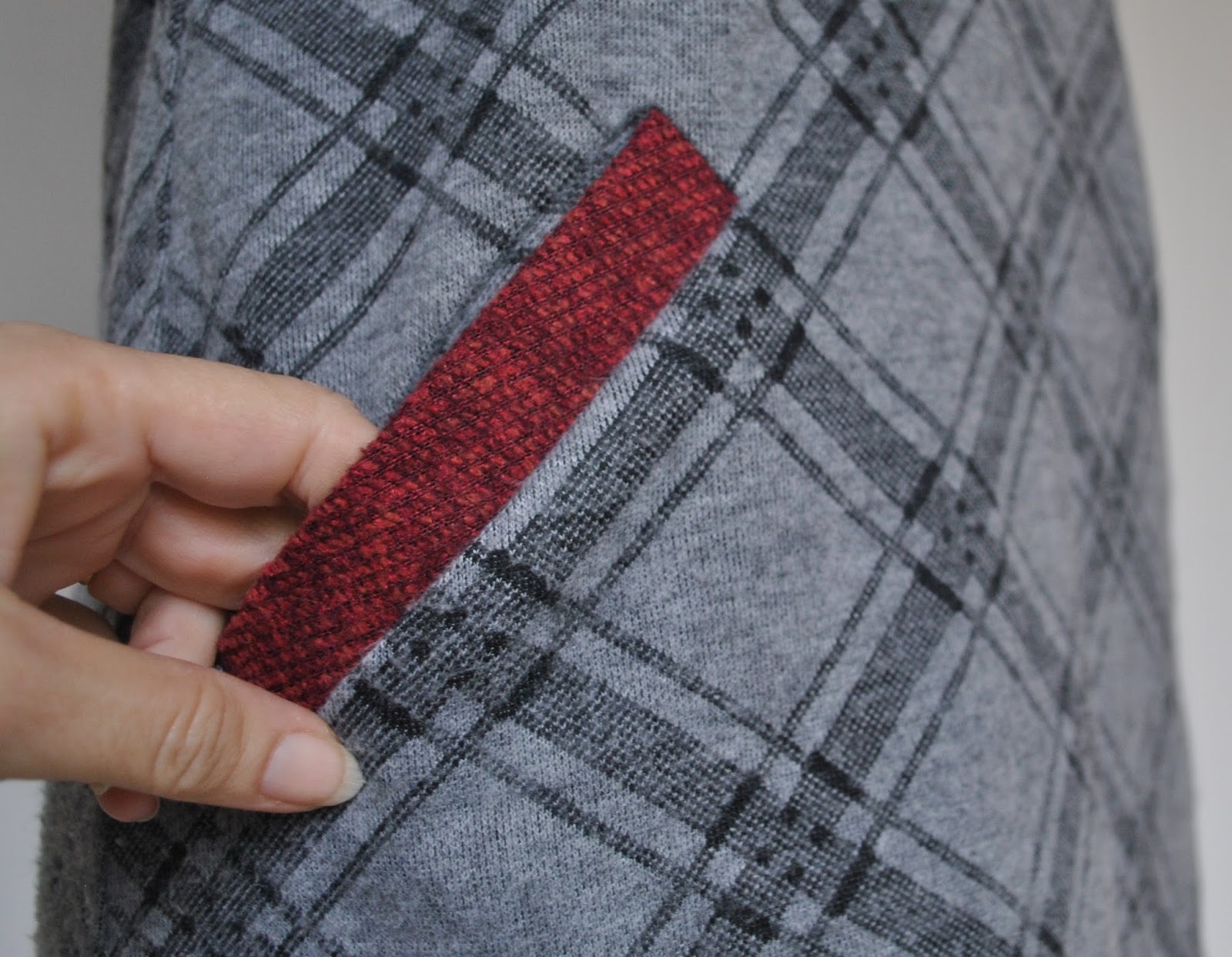 It is very nice fabric, a largish piece of soft fluffy charcoal grey non-stretchy knit stuff with a diagonally printed black check pattern, and a smaller piece of raspberry red woven fabric with an almost chenille-y quality to it. They went so nicely together so I decided to combine the two in one garment.