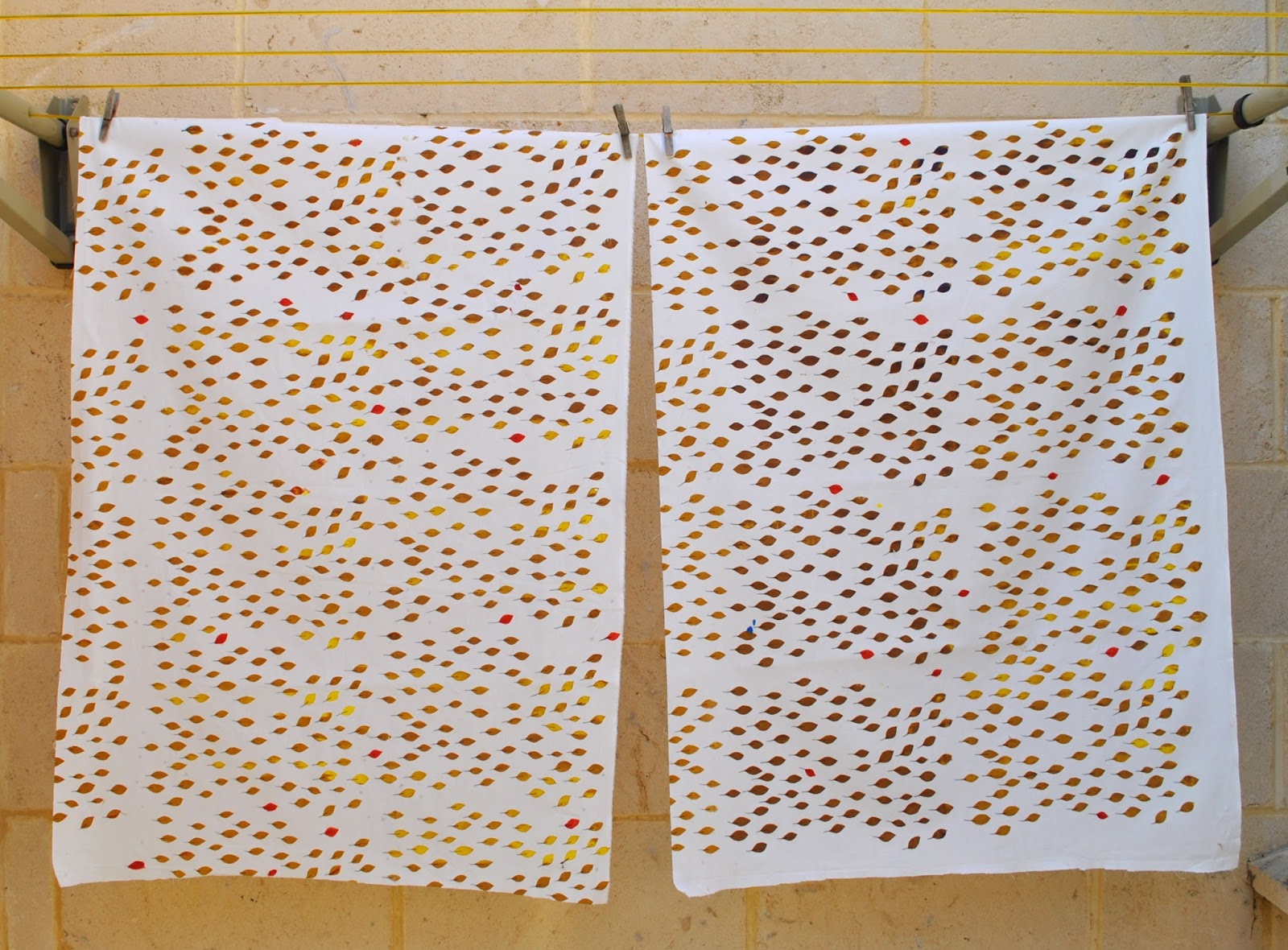 I had to cut two identical paper stencils because I did it in two lots, the first length of fabric in class and the second at home.  My second effort (at left in the picture below) clearly has a much better alignment! haha hardly surprising, that!  and this time, remembering the difficulties I had with cutting pattern pieces from my poppies print, I tried as much as possible to print right up to and over the edges of my fabric pieces.