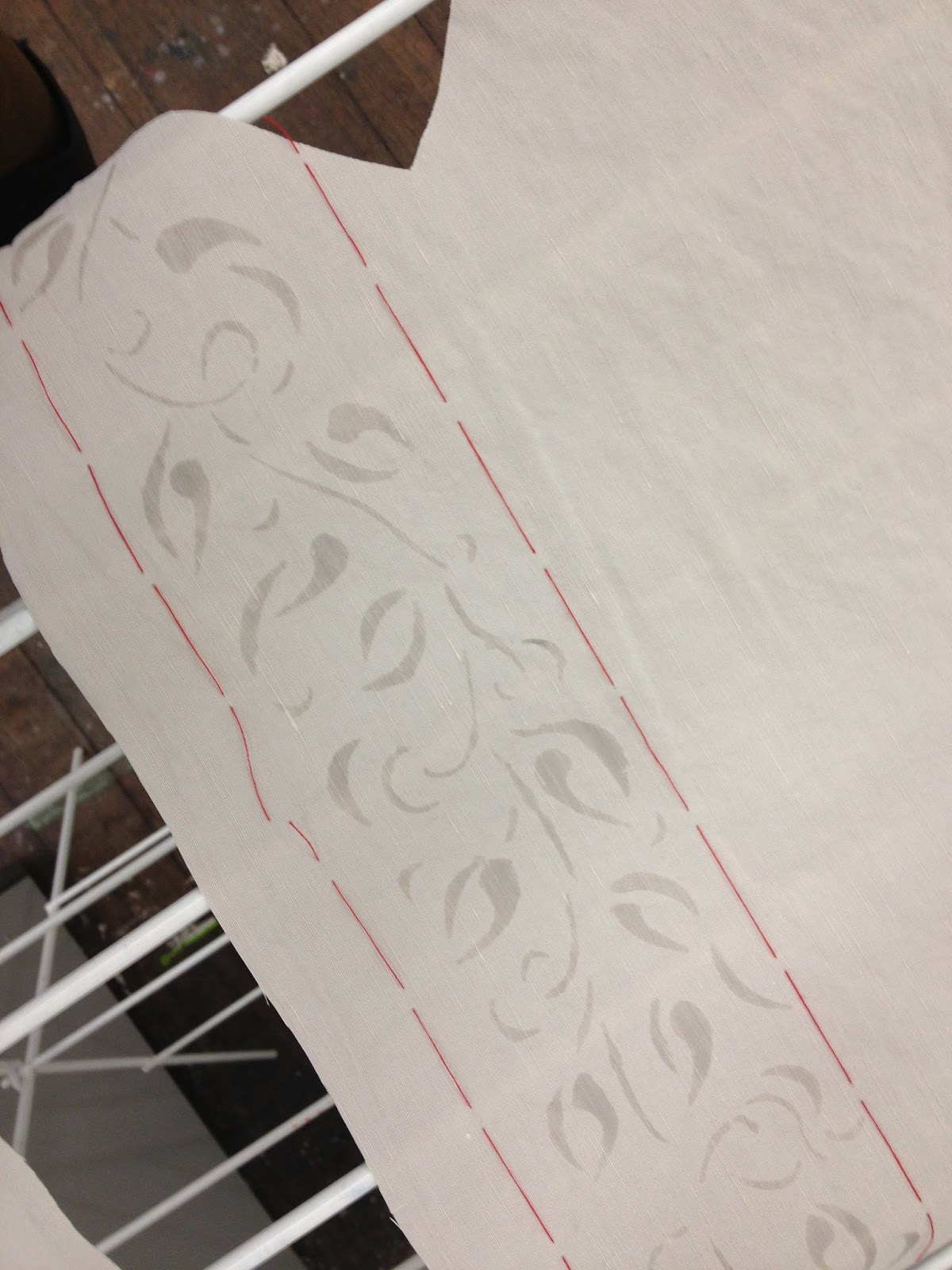 I put a lot of thought into marking the placement of my design … and came up with the following idea; those straight cut-out lines on either side of my stencil were masked with clear, see-through sticky tape, and are intended to be a sort of “window” through which I was hoping to see the lines of red tacking stitches, in order to put the screen down as accurately as possible. Of course, you could just put the screen down on a large piece, print with a wide margin all around, and then cut out your pieces afterwards, but I had only exactly just enough of this pale grey silk/linen for my pieces and needed to be as fabric economical as possible. This approach worked beautifully! and I would definitely do this again if I wanted to print a border design like this.