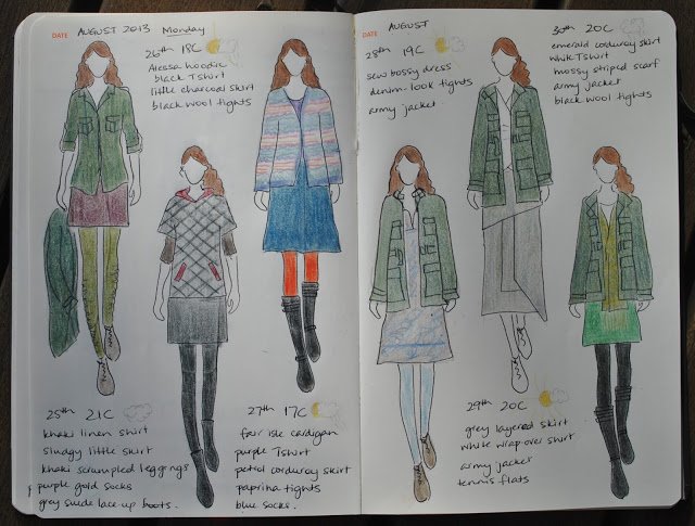 (I’ve pledged to wear only clothes handmade by me this year and to sketch my daily outfits in my Fashionary. I’m calling this the paper doll project)
