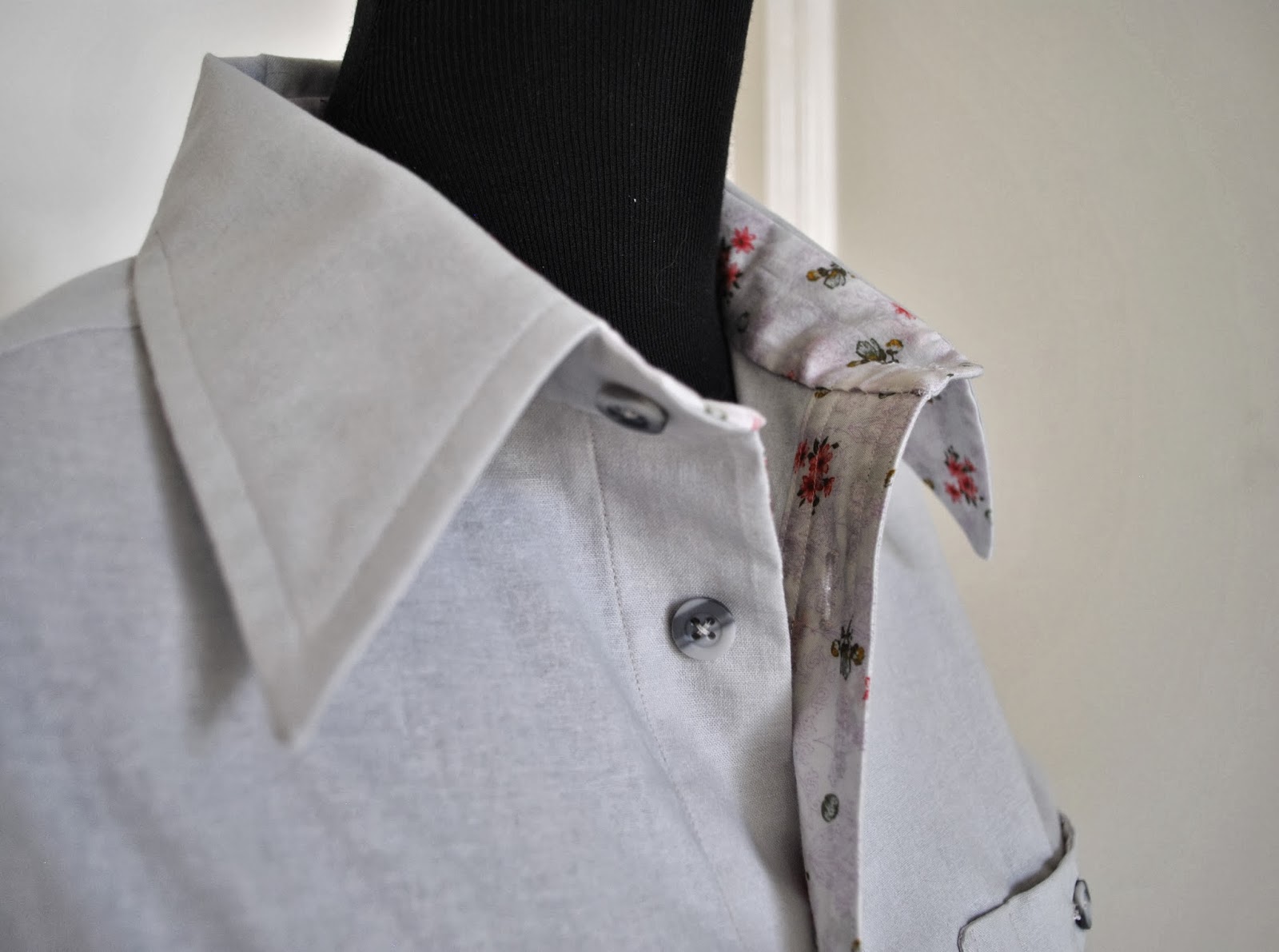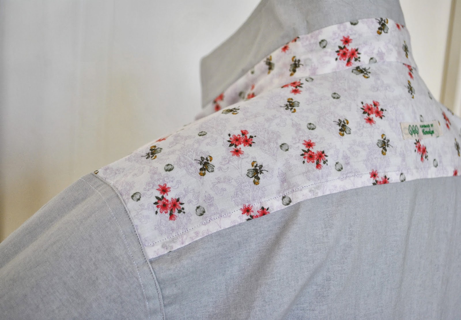 I’ve seen a few shirts in up-to-the-minute menswear boutiques with some panels and parts cut from contrasting prints like paisleys and florals, and wanted to make something like this for Craig.  Thing is though, he’s a fairly conservative dresser who would give major side-eye to anything full-on floral…. too scary!  so to ease him into the trend gently and painlessly I just sneaked it in, in innocuous spots, for facings and mostly inside parts.  Meaning at a casual glance you only get tantalising glimpses that it is not just a boring old plain grey shirt.   Fortunately this was acceptable.  Phew!
