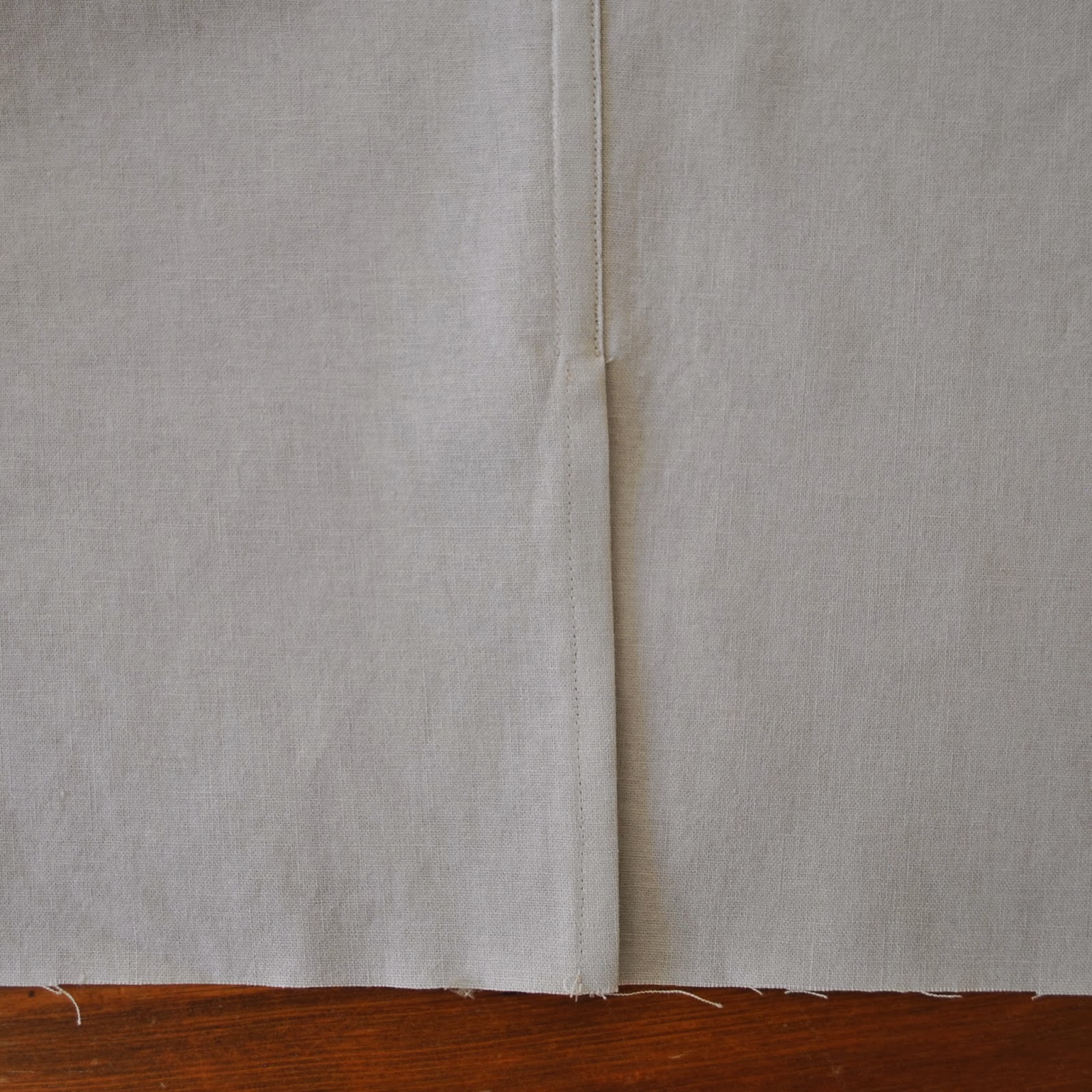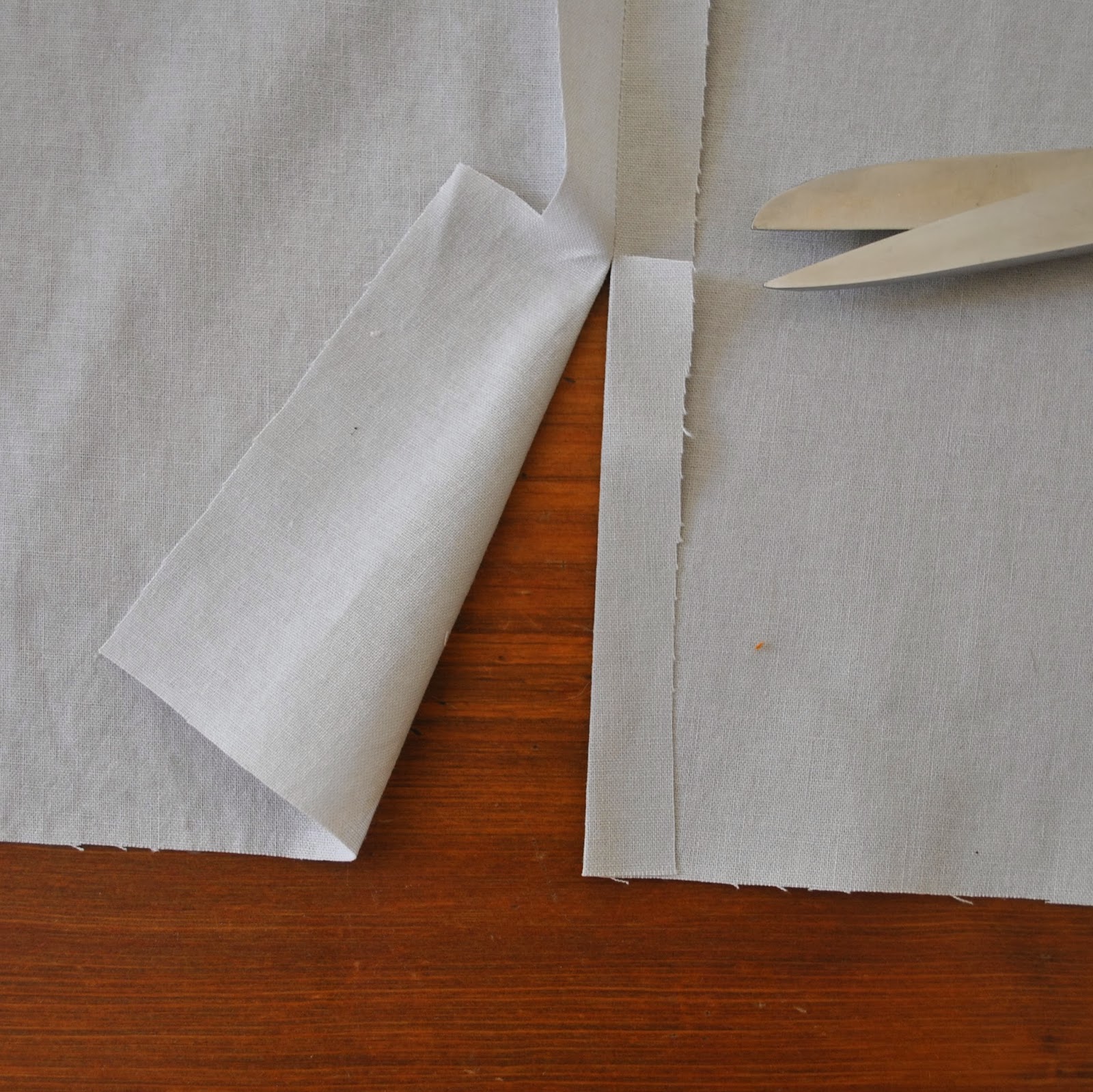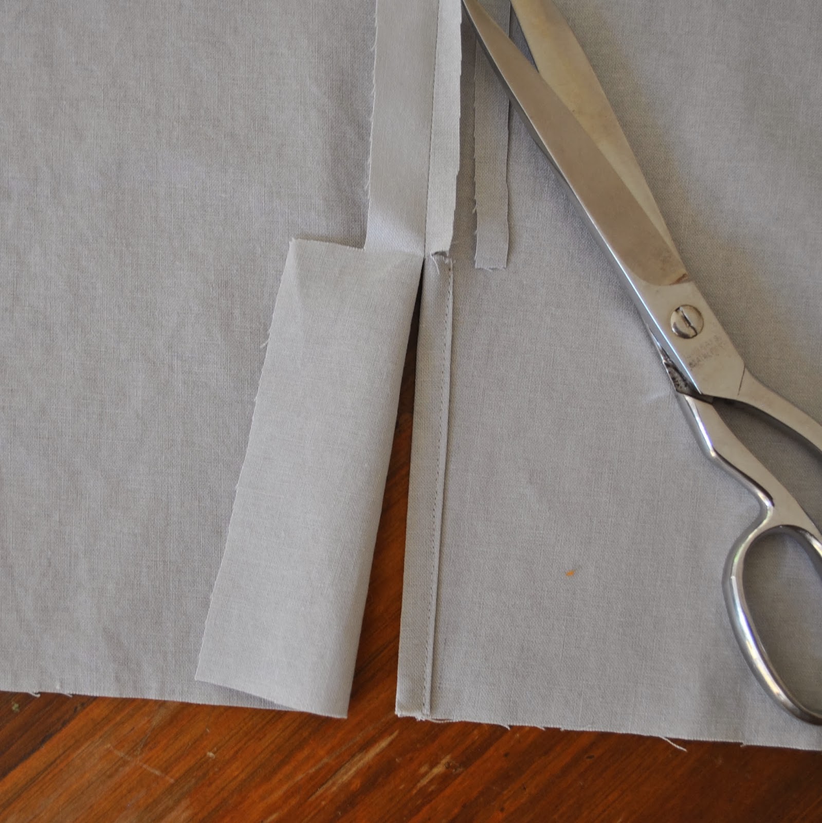 To have this feature, you have to plan ahead and cut an extra little extension, or tab, on the outer edge of either front or back; about 11.5cm in height for a 10cm split. I randomly chose for the front edge to have the tab so as to flat-fell the seams towards the back as my own convention; but it looks equally fine either way.