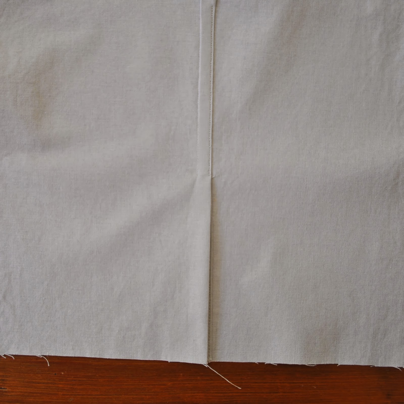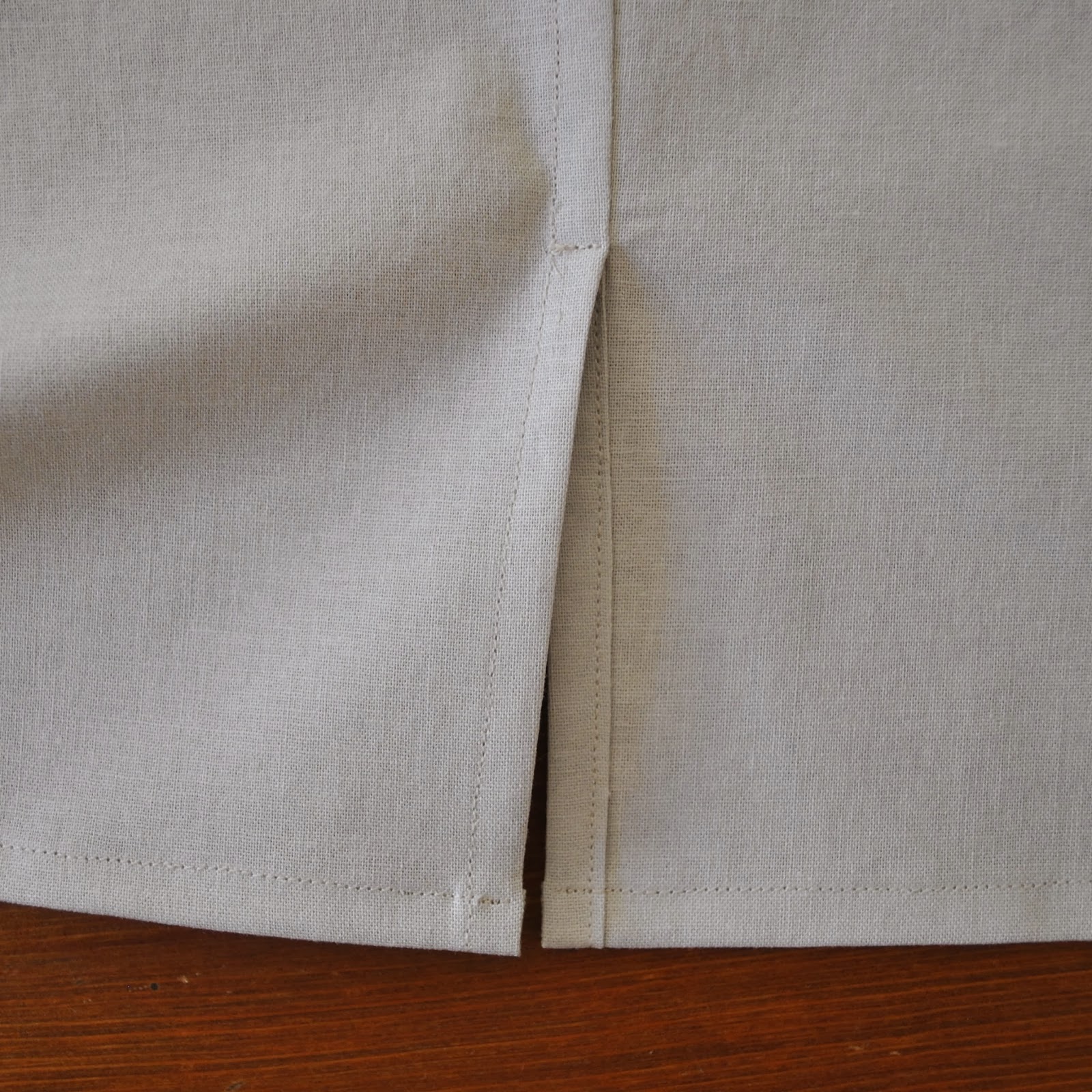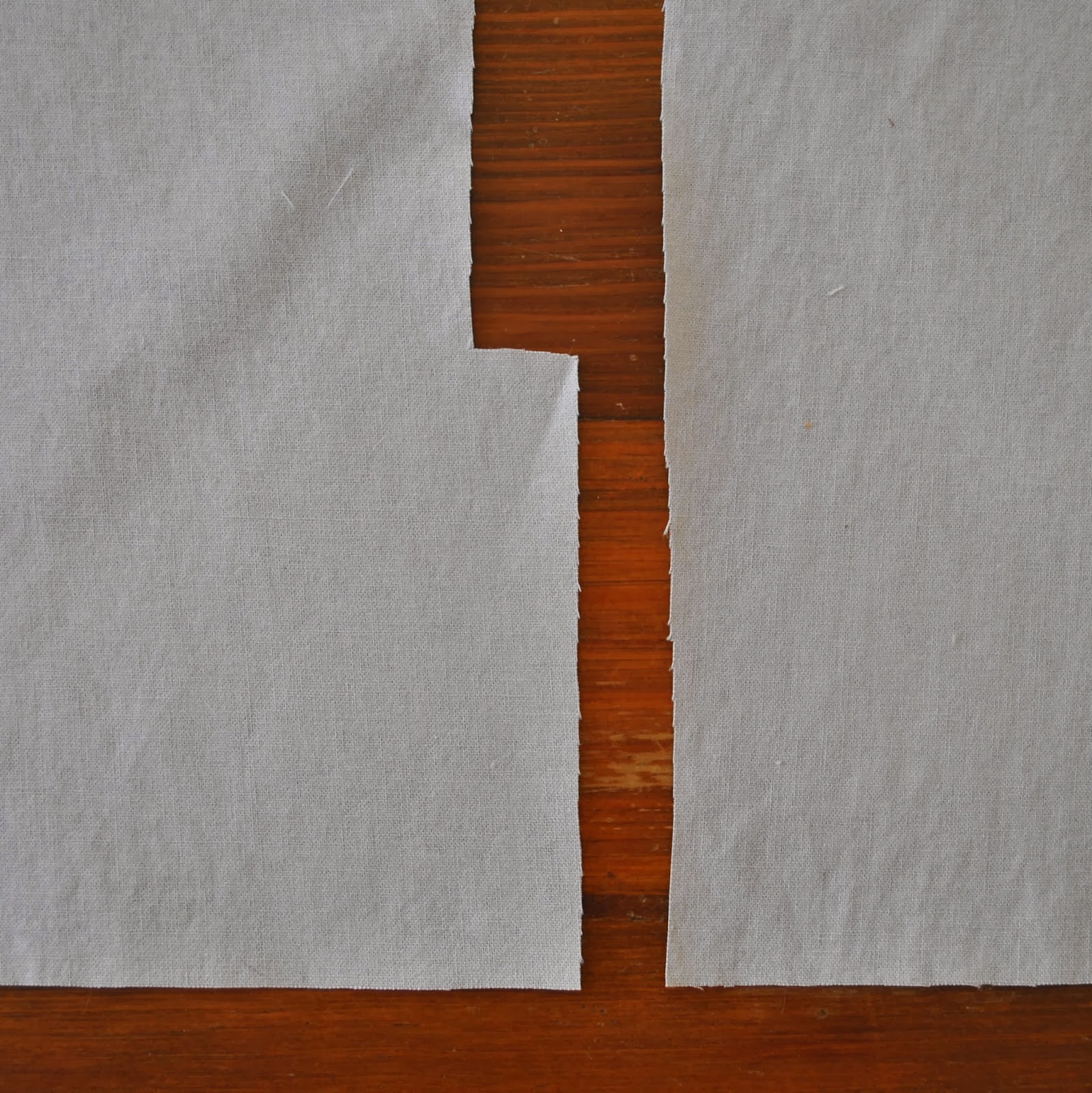 To have this feature, you have to plan ahead and cut an extra little extension, or tab, on the outer edge of either front or back; about 11.5cm in height for a 10cm split. I randomly chose for the front edge to have the tab so as to flat-fell the seams towards the back as my own convention; but it looks equally fine either way.