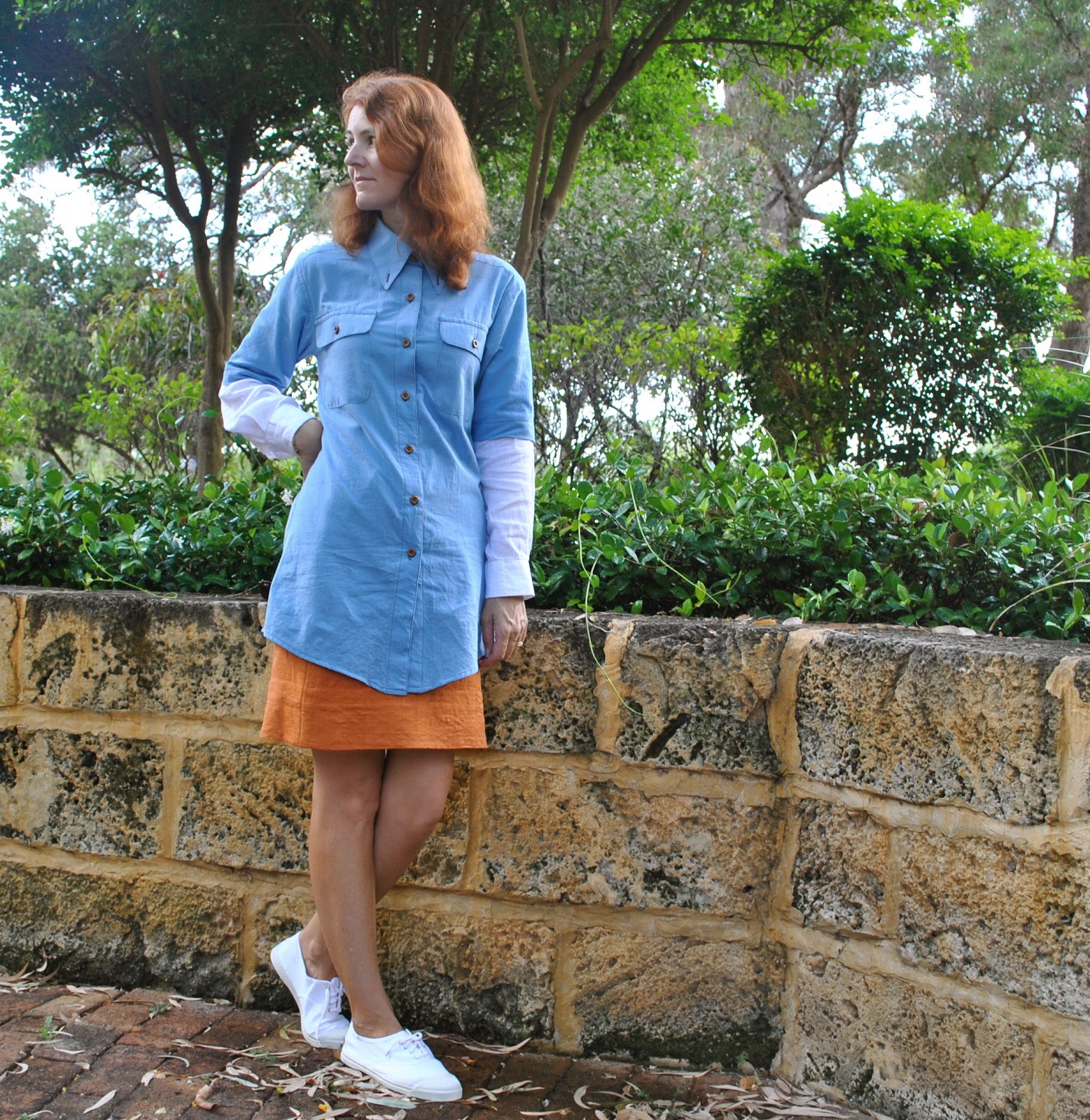 version twenty-two: cotton shirt for me, now belonging to Cassie and worn as a dress.  Super long length, a curved hemline, and with double, layered sleeves;  a long sleeve linen sleeve underneath a short cotton sleeve.  Square pockets with arrowhead pocket flaps and a button-down collar.