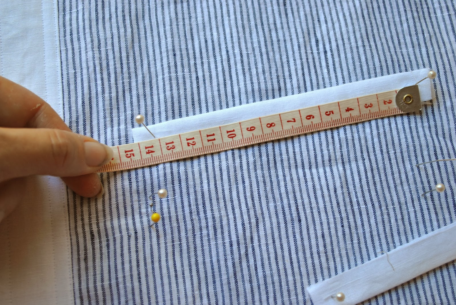Press the welt strips in half lengthwise, wrong sides together, and place pins in each to mark the length and width of each welt. In this case, a length of 13cm and a width of 7.5mm.