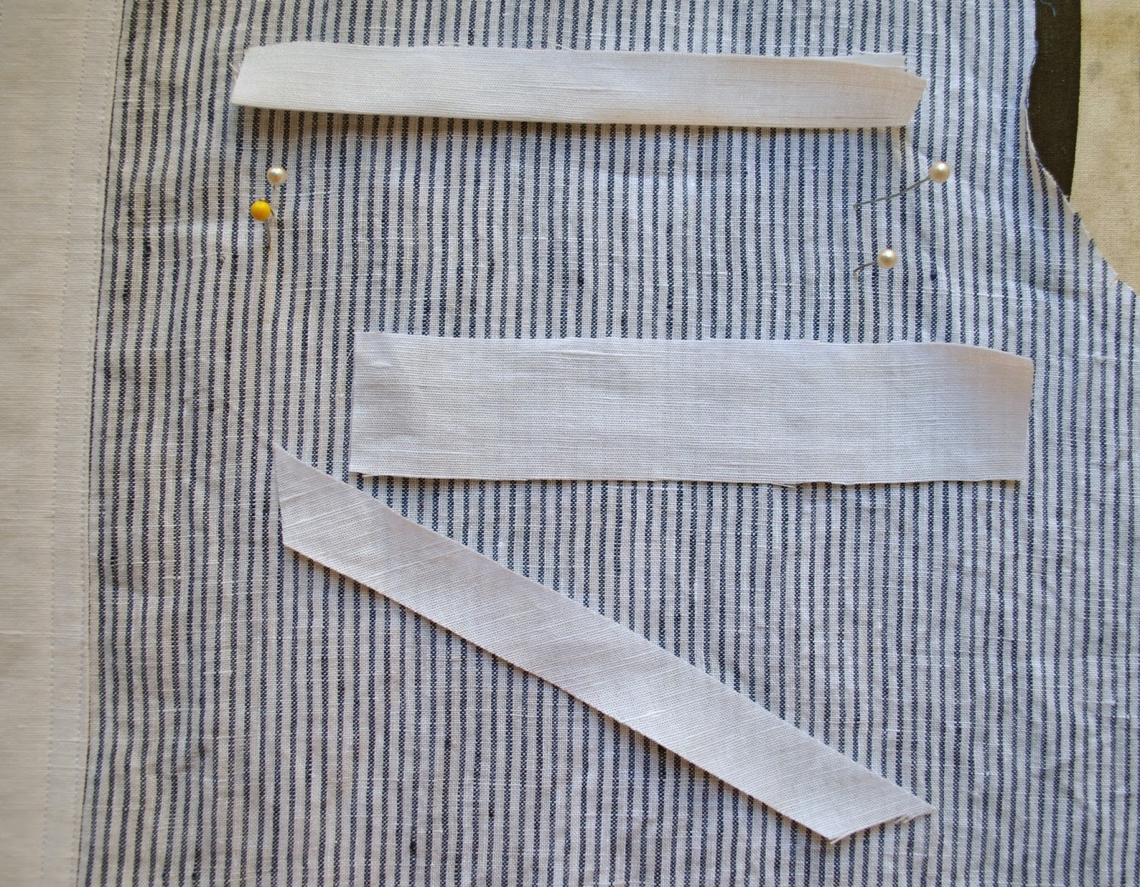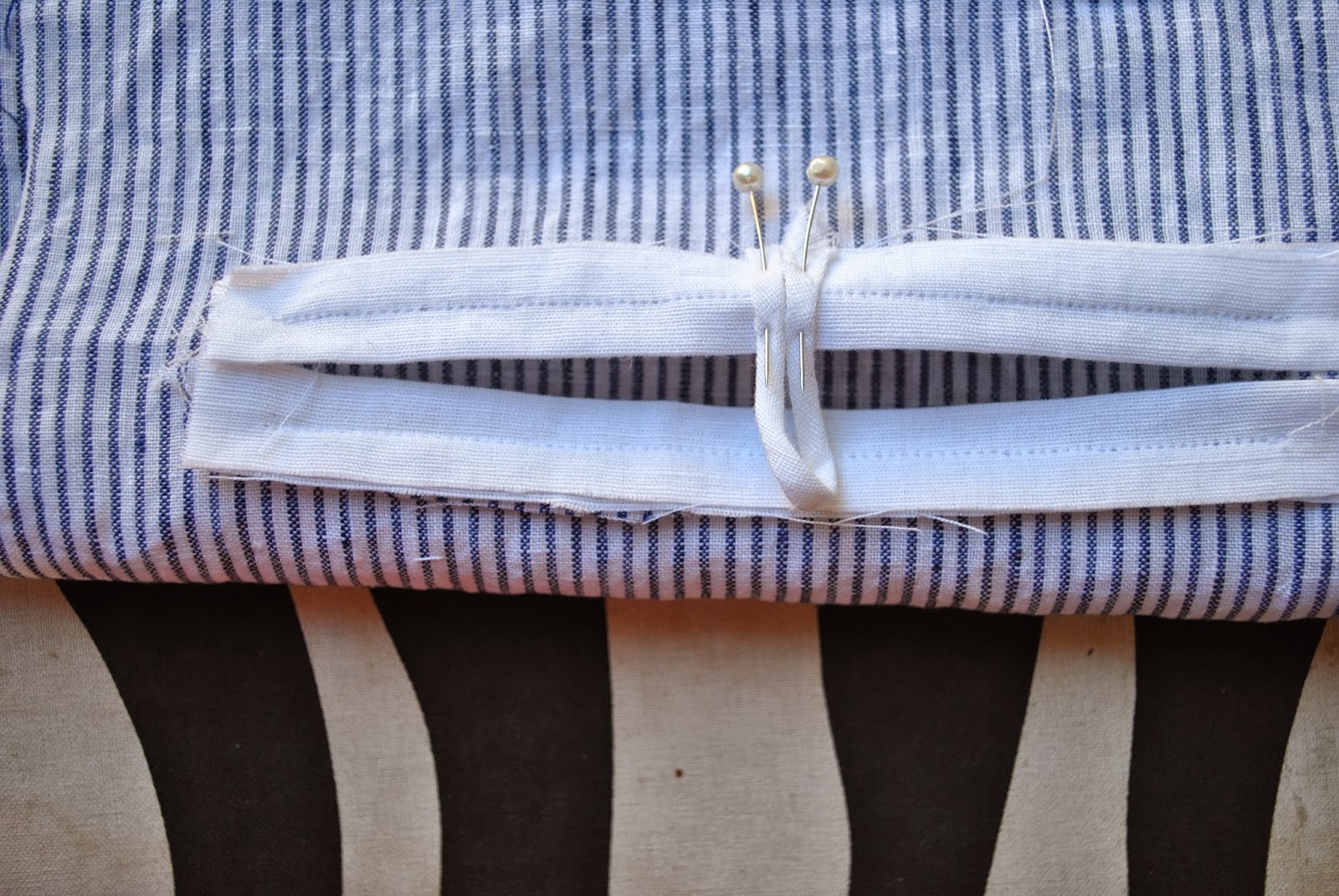 With the pressed folds of the welt strips facing out and the open raw edges towards the middle; put these pins in exactly the same pinholes as those previously made to mark the welt position. Arrange the welts to lie smooth, flat and straight.