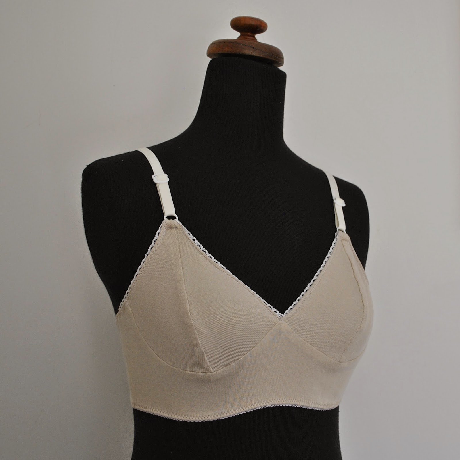I used a sand-coloured cotton jersey, (the Morrison remnant sale), lining the bra cups and cradle with soft, sand-coloured rayon stretch (Fabulous Fabrics), pretty scalloped-edge lingerie elastic (Fabulous Fabrics) and plush elastic for the bra straps (Homecraft Textiles).