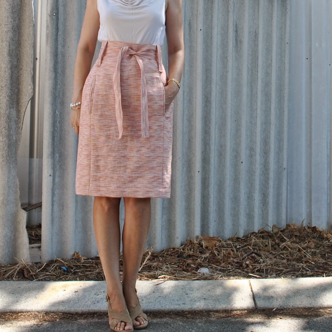 Thats a lovely skirt and a great outfit, like peaches and cream. Can't wear high waisted myself but would love to adapt a pattern and use that topstitching detail on the pockets, thanks.