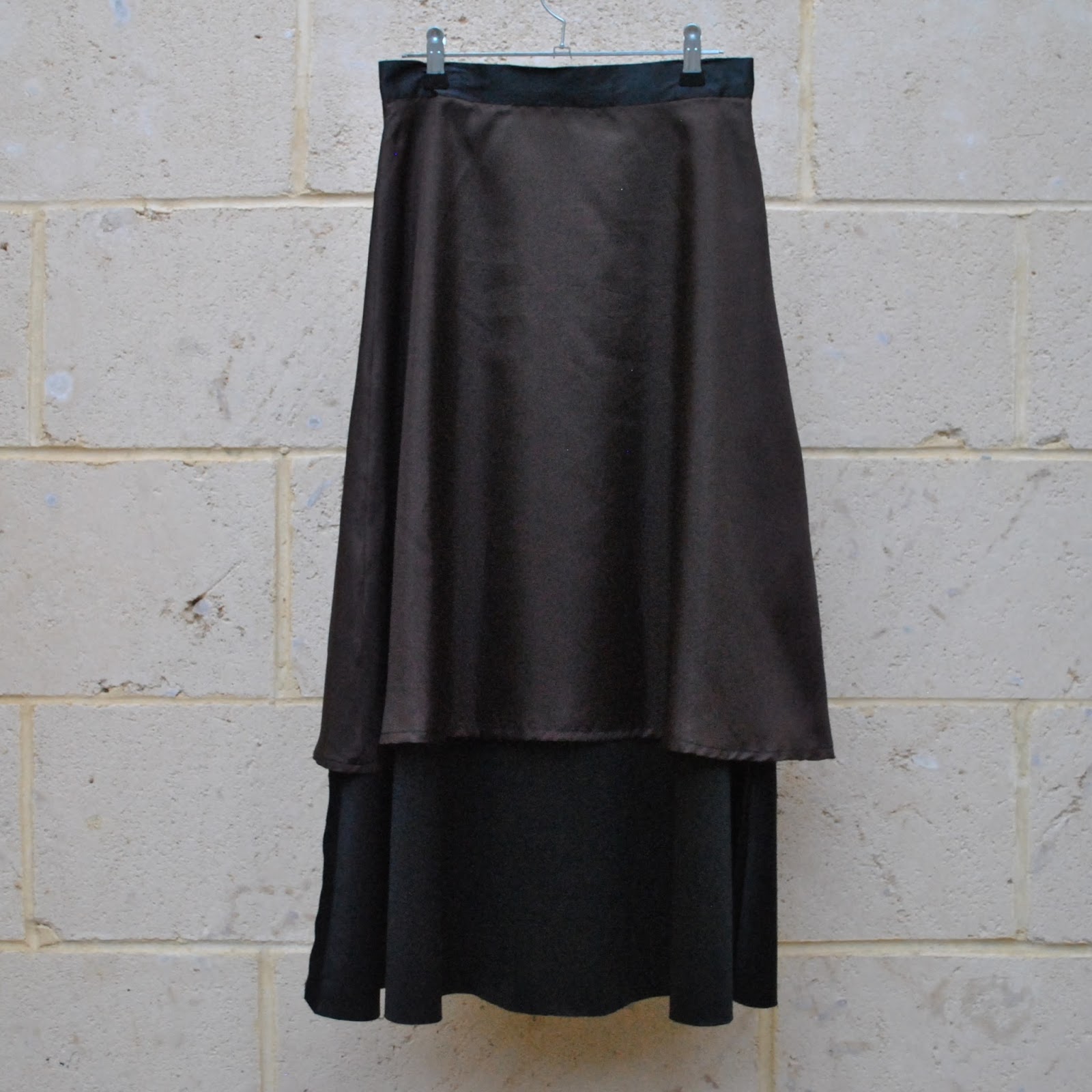 Fake leather is from Spotlight, all other materials from Fabulous Fabrics. Lined with chocolate polyacetate lining fabric and with a waistband of black silk dupion leftover from my cow skirt.