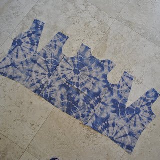 After cutting these: the fabric is then re-folded in from each edge so as to cut those two fronts (below) on a fold, with the centre front laid on each fold. Cut from the inside shoulder edge out to the CF fold at bustline level on a straight diagonal line, to create the V-neck opening edge.