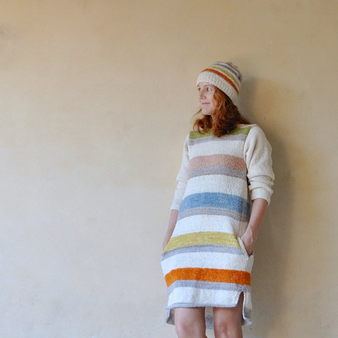 What did I make: a simple knitted dress and a matching beanie, showcasing my dyeing experiments in stripes. I just wanted my hard-won colours to shine on their own merits equally without competing with each other, and individual stripes separated by the blankness of the natural undyed ivory just seemed a good way to accomplish this.