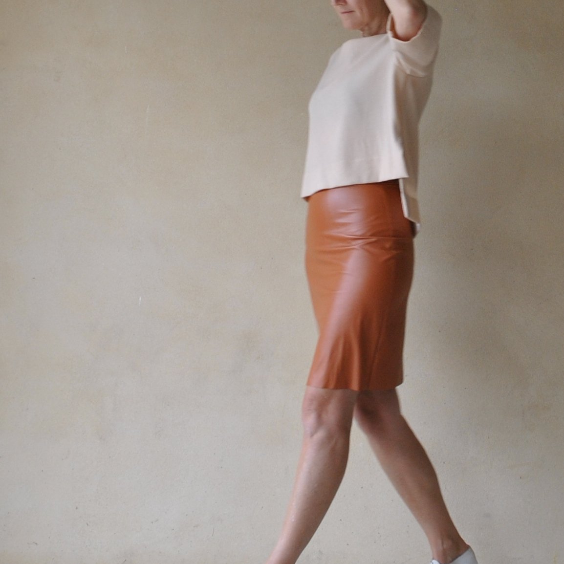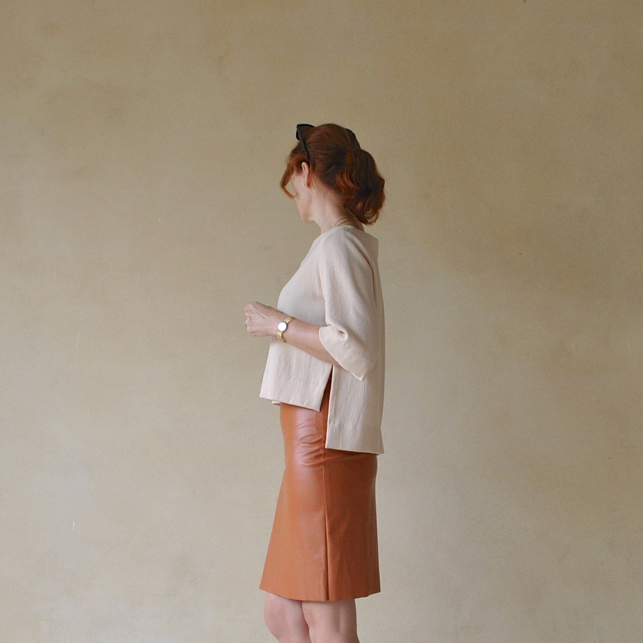 I also cut the lower hemline to have a curved “shirttail” line to it. The hems and the neckline are all finished by hand, because I really wanted to have a smooth clean stitch-free expanse of fabric with absolutely no visible topstitching anywhere. This is about as invisible as I could get.