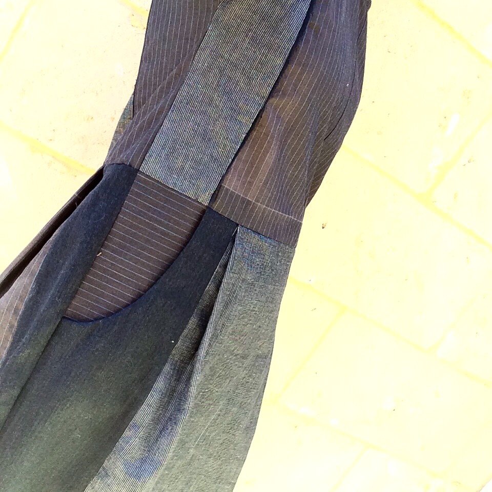 But maybe I should talk about this one, my first “muslin” version first… I made this one using three pairs of my husband’s old dress trousers, respectively a charcoal wool, charcoal and white cotton/linen pinstripe, and a chocolate/blue cotton pinstripe… these have been in my refashioning bag so long there was actually an old spider’s nest on one of them! eeeek! I gave them all a quick brush over the garden and then into the washing machine they went… then it was out with the scissors… snip snip!