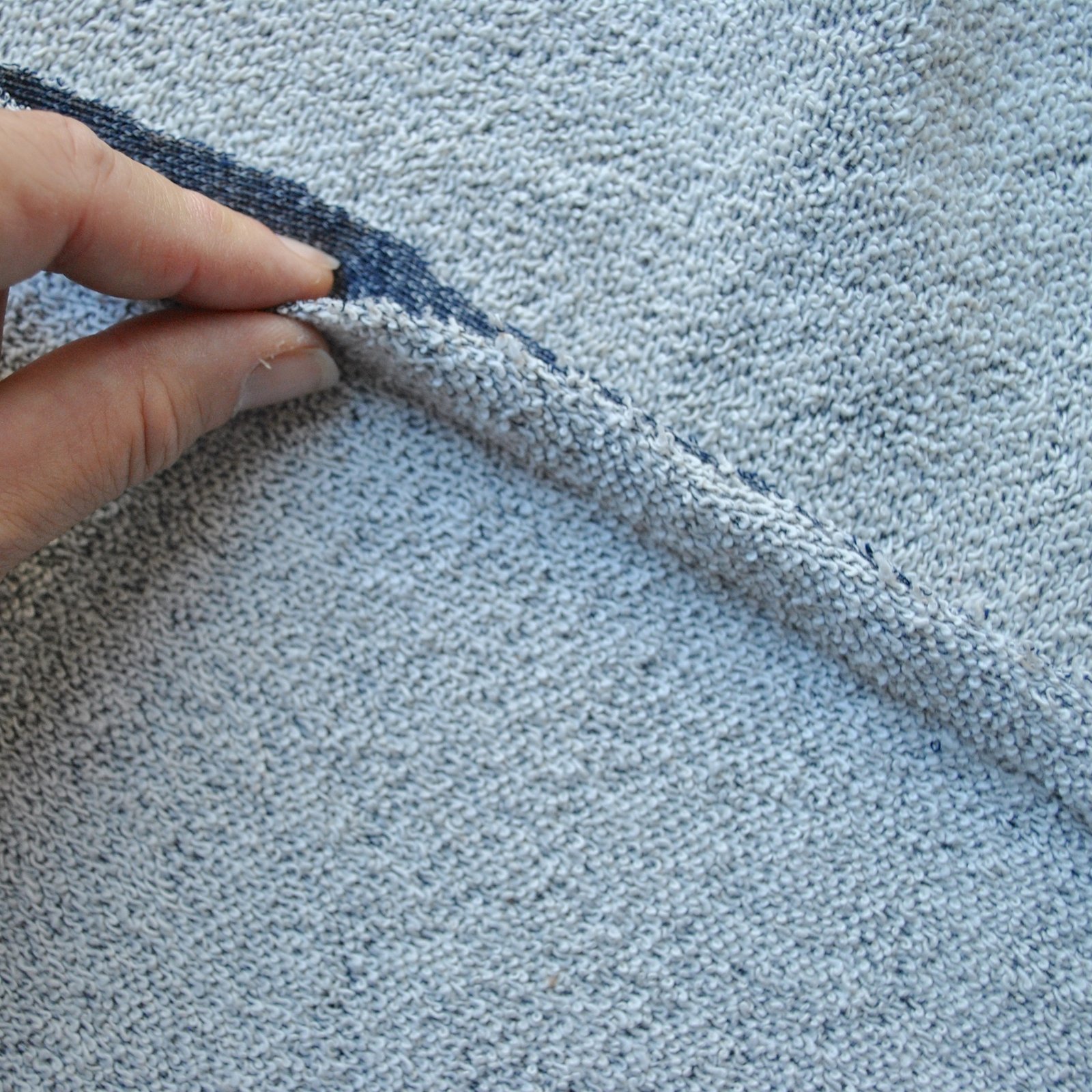 Of course it’s easy to clone a sweatshirt, but the challenge is in finding suitable fabric! I found this blue marled French terry in Spotlight, and while the colour is a teeny bit blah and the texture is not as nice as his original sweatshirt, it’s going to make a reasonable stop-gap until winter rolls around, the winter fabrics come into the shops, and hopefully I can find something nicer.  I busted a gut finishing off all the seam allowances off beautifully inside though… imitating the exceptionally beautiful finishes that were in the original.  For the pockets and bias binding I used some of the leftover navy/white gingham that I used for Sam’s shirt, above.  The pockets are French-seamed and the rest of the seams have an interesting amalgamation of HongKong bound AND flat-felled seams… not sure if my method is the same as in the original but I worked out a way to do it and took a few pictures along the way.