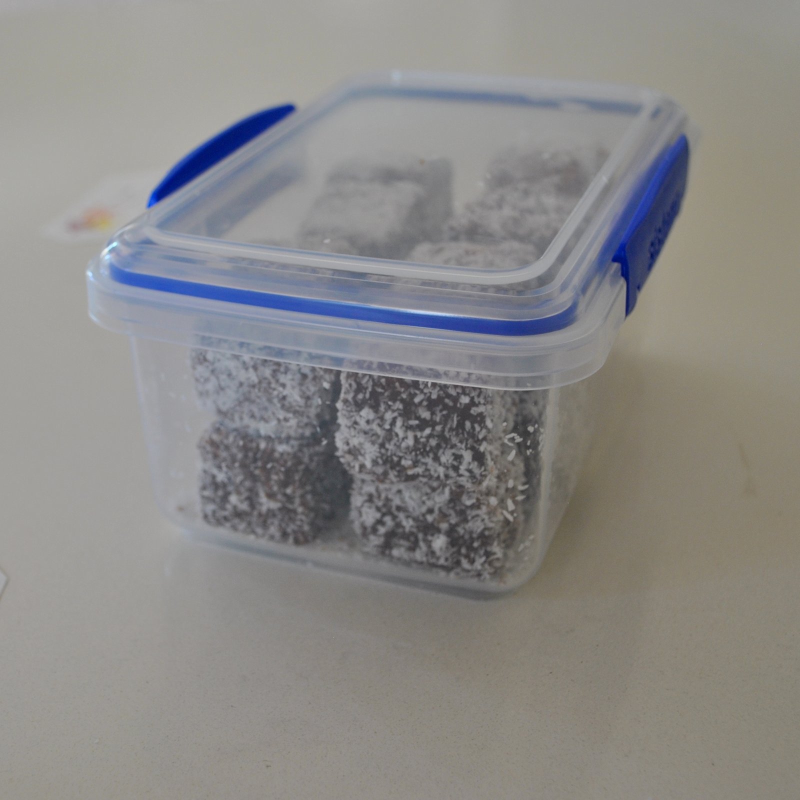 Real talk; this rather prosaic and un-pretty packaging below is how my family actually receives them….  when it comes to serving them up to guests I like to arrange them either in a militarily, strict grid on a square plate… OR even looking all dishevelledly pretty in a jumbled mini-mountain of lamington-boulders, like in the picture at top; but to give them away I buy these airtight, snap-lock boxes from the supermarket to pack ’em in.   Not super glamorous but they are super practical… so people can pop the boxes straight into the freezer, and keep the containers afterwards to store other food in them, if they wish.