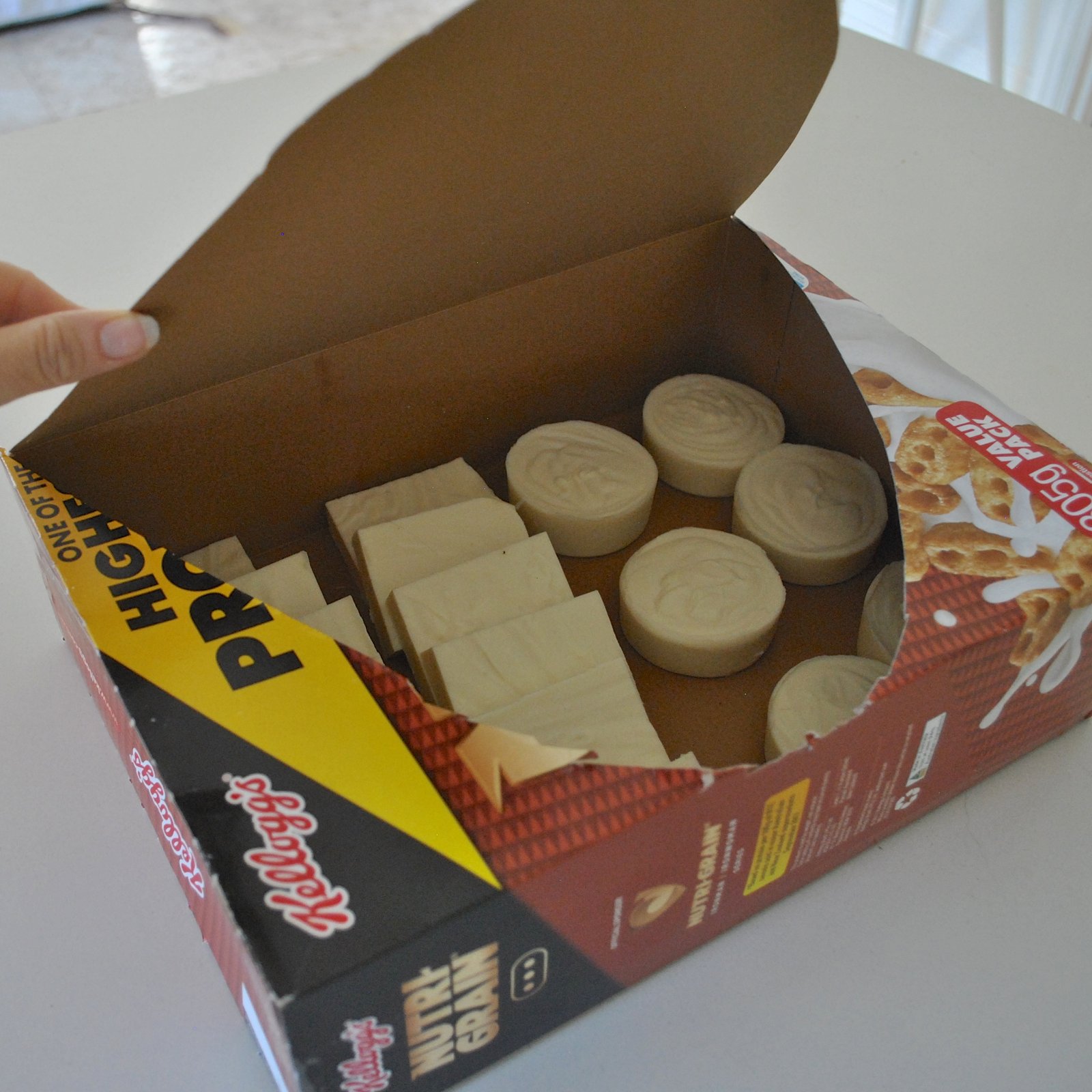 The muffin “tins” were great because the soaps just popped out ready formed and don’t need any further shaping… but I like the more conventionally shaped bars I cut from the slabs of soap too. The soaps need to cure for at least 6 weeks in a non-airtight container before using; I used old cardboard cereal boxes and have stored them up high on my overhead kitchen cabinets so they’re out of the way.
