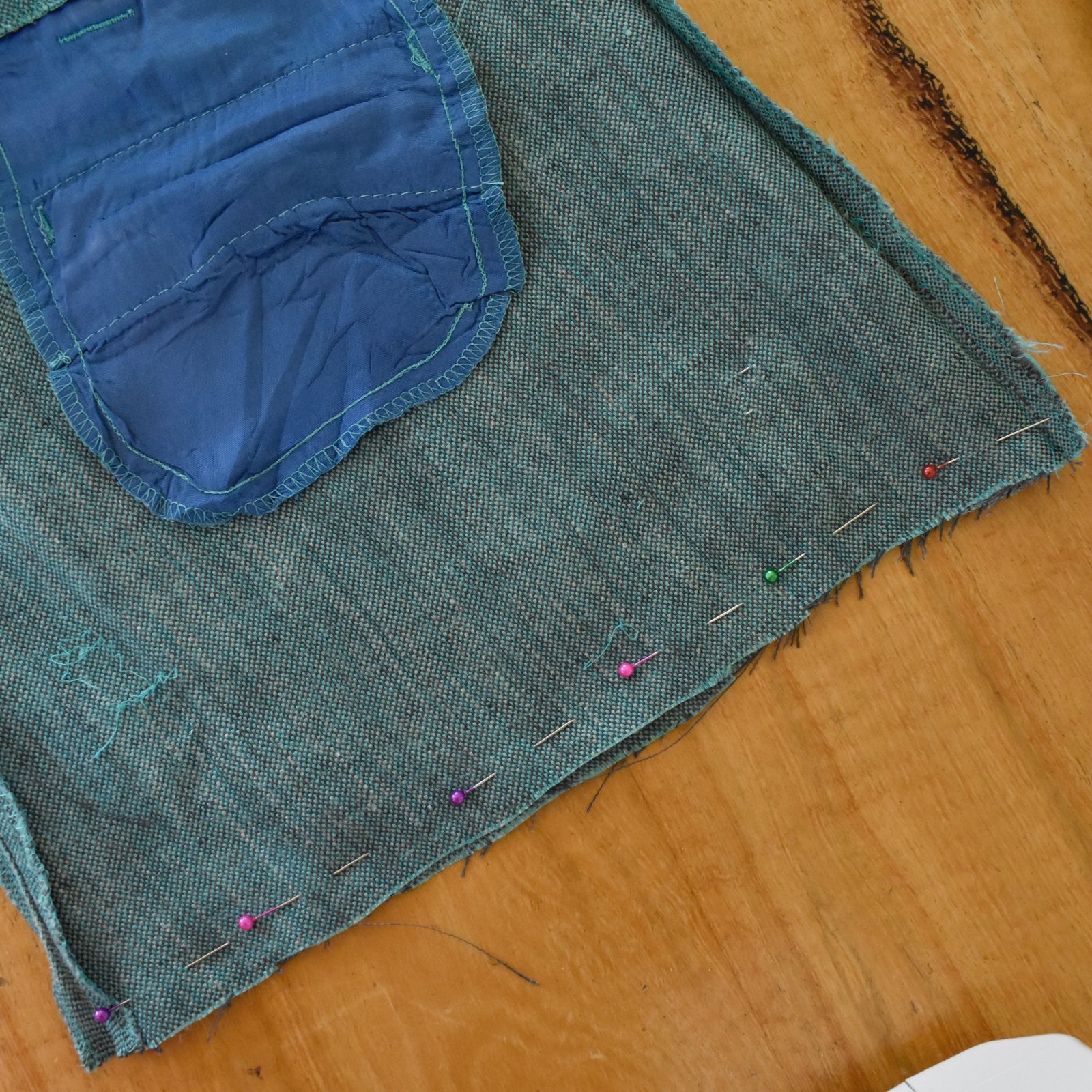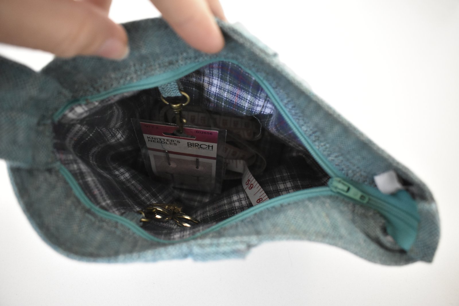 I perused Le Stash, and my hand fell on some lovely garden-green raw silk, mainly because I knew I had a matching zip in my zip stash already too. The green silk turned out to be a pair of trousers, that Mum herself had originally give to me to use for fabric sometime. She’d originally bought them in Italy, while on holiday, and got many years of good use out of them. It occurred to me I could make a really good little project bag, utilising the trousers’ existing welt pockets and waistband… bonus that this lovely fabric is boomeranging its way back to Mum in a new, and newly useful form. Full circle! I selected some brushed tartan cotton for the bags’s lining, and inserted a new zip underneath the waistband facing inside, along with a wrist strap, so she can have the bag hanging from her wrist and still knit from it. I think the really interesting thing about the bag though is the accessories; I added three little tabs inside, two with swivel clips, to which I attached a pair of scissors, and a pack of wool needles, and the third has a D-ring to which I’ve sewn a tape measure. I left the original back welt pockets intact on the outside (above), so she can tuck small extra things into those pockets, things she might not want to go rattling around the inside of the bag.