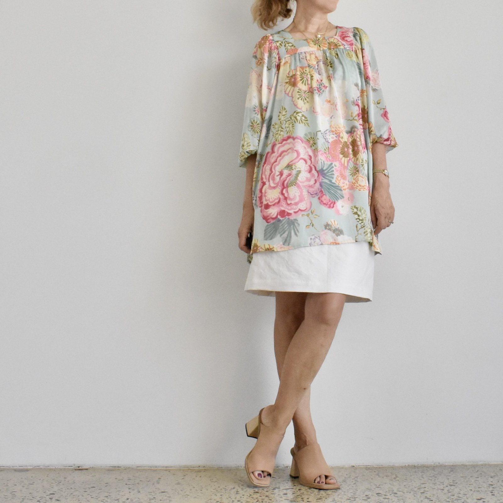 below; Lainey wears Meelup view A, in a very denim-like cotton duck in a lovely lush floral print. She is also wearing our Booragoon top in blue cotton jersey, and my Pinjarra cardigan in pink merino knit…