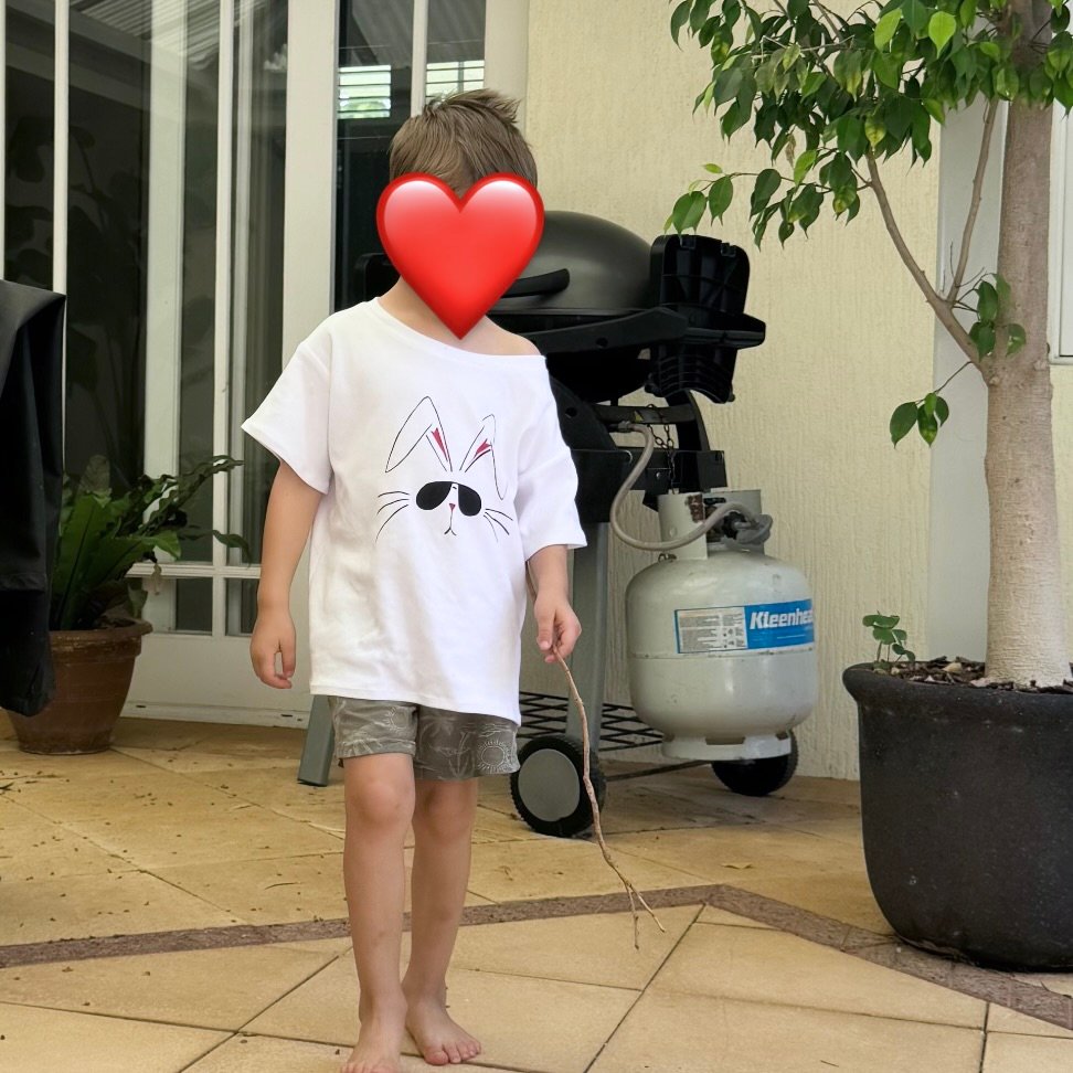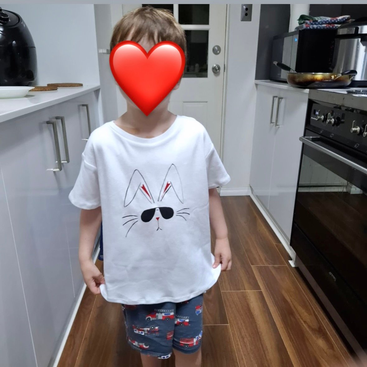 Hello! For the Easter just gone by I wanted to give something to my three little grandsons… chocolate has been ruled out by the parents and so I had to think of something else. I decided upon this! As a teen, my eldest Tim used to have a pink T-shirt with a “cool bunny” printed on it which he absolutely loved. It was actually a very different print from this one, but with this in mind I googled “cool bunny” and something like this was one of the millions that came up. I thought it was really cute!