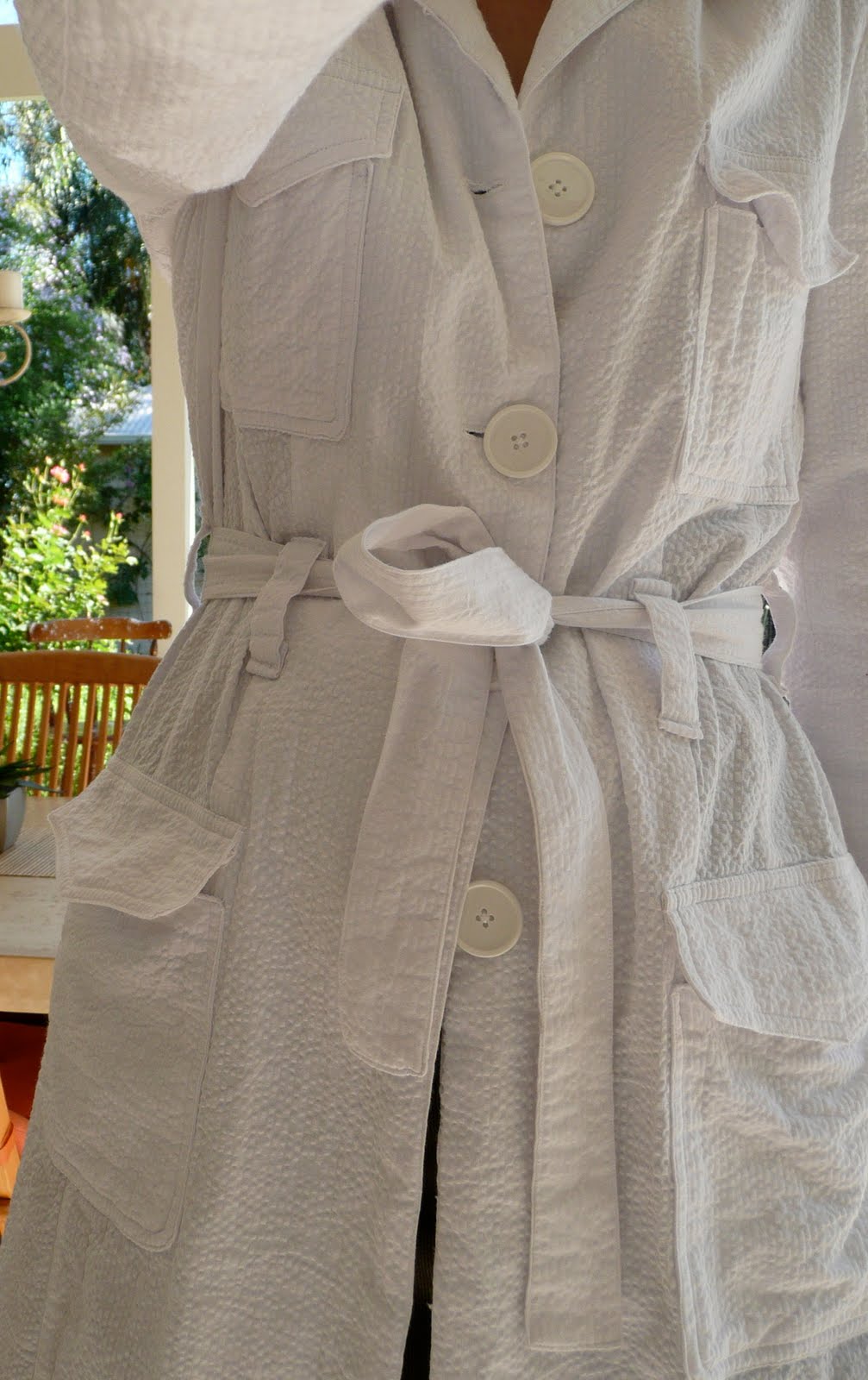 Home seamstresses will concur that half the hurdles of DIY are sourcing the fabric you envisage for a project; in this case I went with this seersucker in spite of its white colour which wasn’t my ideal. I really wanted more of a beige or tan or even chocolate coloured cotton, as a classic trench coat colour but couldn’t find anything which fitted the bill. I feel this white is a bit too “lab coat”. As my original career was as an analytical chemist when I wore a lab coat day in day out I’m keenly aware of avoiding the lab coat look! However the belt on this one makes it less lab coat, and even though its a bright bright white this has ended up being a good useful fashion choice for summer. I think I’ll keep it going for another summer in this guise, then will probably dye it for next summer, for a change.