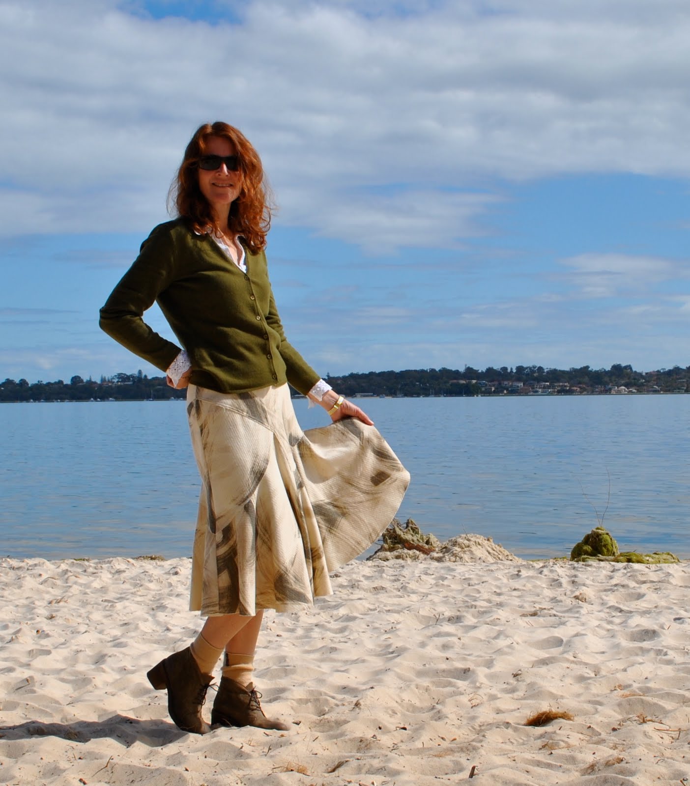 Anyhoo, this was my ensemble for the event; the skirt is Vogue 8296 view B, made this winter just gone.  The fabric is wool, a sort of winter white, overprinted with lovely brushstroke swirls of olivey taupe.  I bought it from Astratex in Melbourne on a trip with my mother.  The fabric was quite expensive and the pattern called for a lot of it, something for future consideration (ie. use different pattern).  The pattern itself was very simple and went together quickly with no drama, front and back identical to each other.  I love the look of this skirt and the fabric is luxurious and gorgeous to wear so I’m glad I went to the extra expense for an “occasion” garment.  However, the silk lining was, and is, a problem.  The pattern called for it to be cut on the bias, which I did.  However the silk I used is so clingy and is always winding its way around my legs.  It also doesn’t hang quite right when I look at it inside the skirt; and I think this is because of being on the bias.  Or maybe it’s because silk is notorious for being a bit precious and temperamental.  The Lindsay Lohan of fabrics.