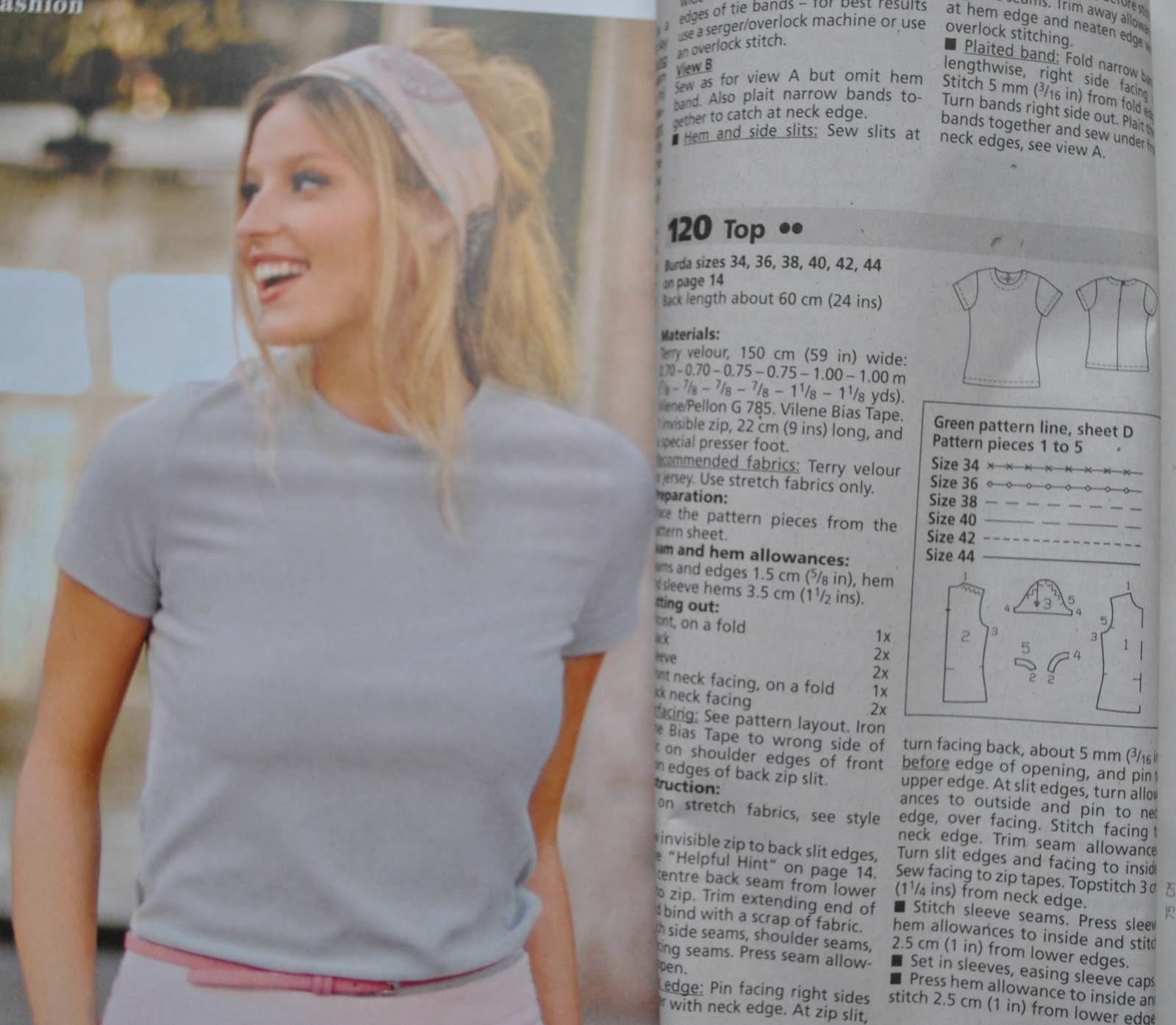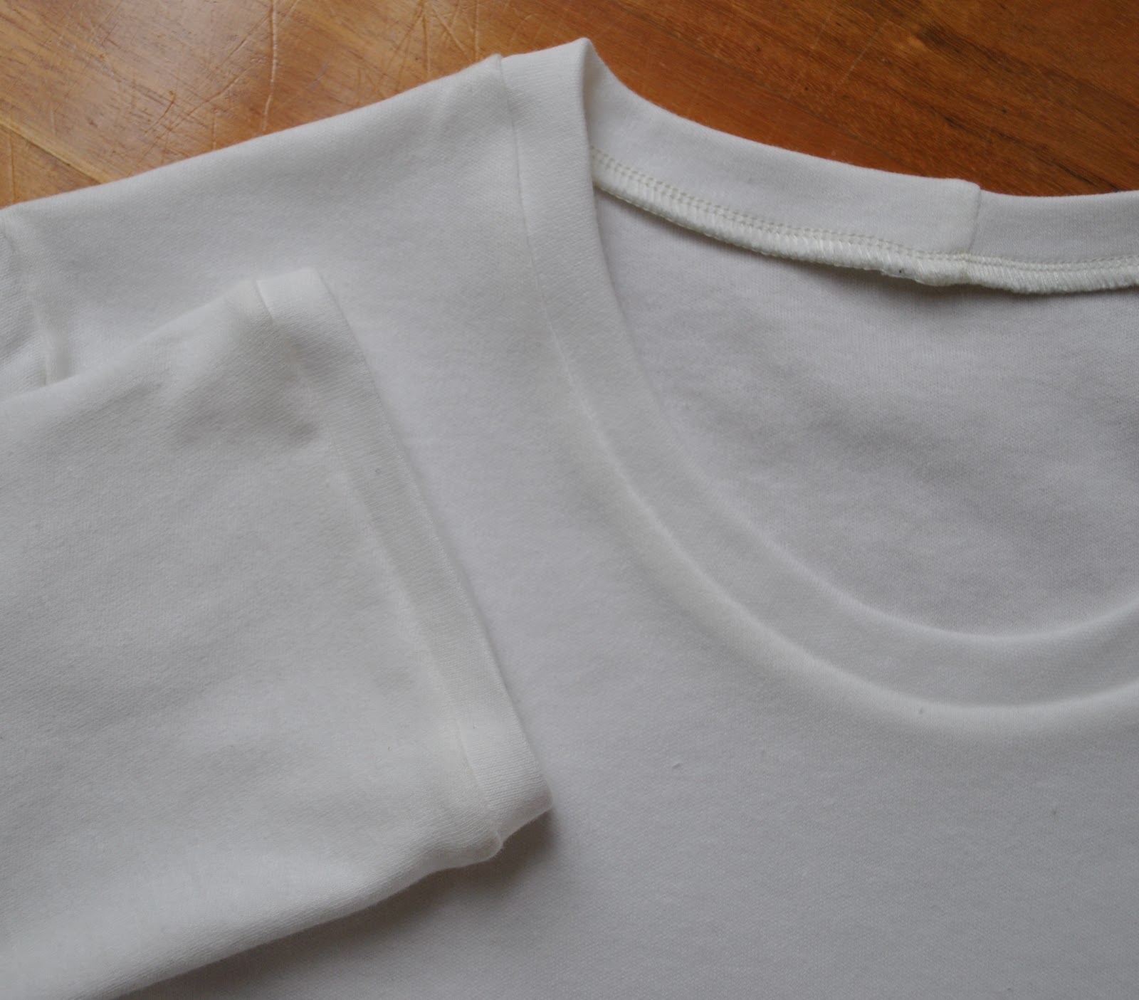 Tshirt 4: the first T-shirt made from the leftovers after the dress, using the same fabric and the same pattern as these other T-shirts, and it hasn’t been shown it here before….  It has a banded neckline and sleeve bands, and a turned up, hand-stitched hem.