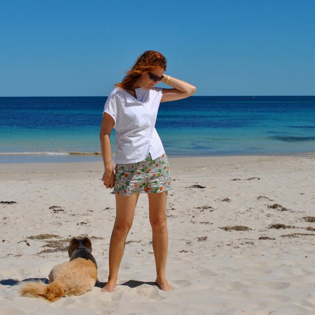 Remember I wrote I’d made some matching shorts to wear under this little sundress? Well, here they are. Whew, they are so so short and flimsy I probably wouldn’t be wearing them on their own like this if I didn’t…