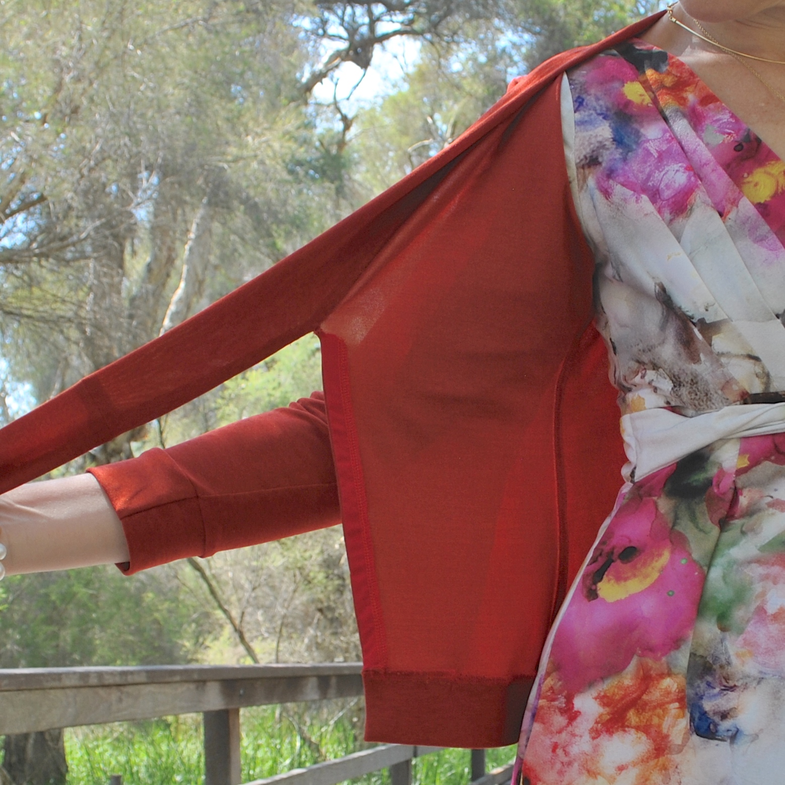 Cardigan; my own design modifications to the Nettie bodysuit, by Closet Case patterns, paprika stretch