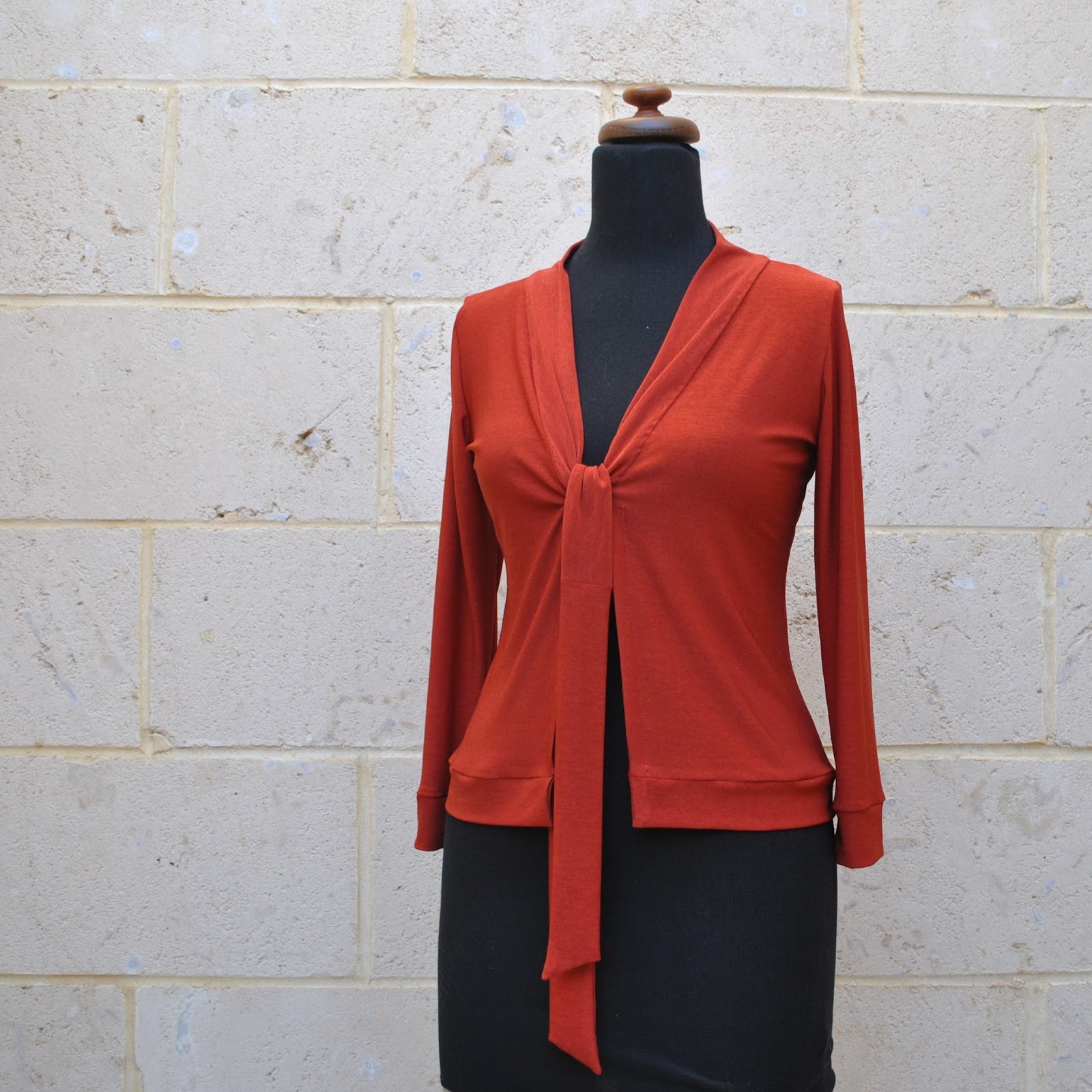It’s mostly made from scraps; a piece of paprika stretch knit from Fabulous Fabrics, leftover from my paprika Nettie bodysuit and I bought a little extra to get out the pieces for this cardigan. Once again I used the fabric wrong side out, because I prefer the duller, deeper, richer colour of it.