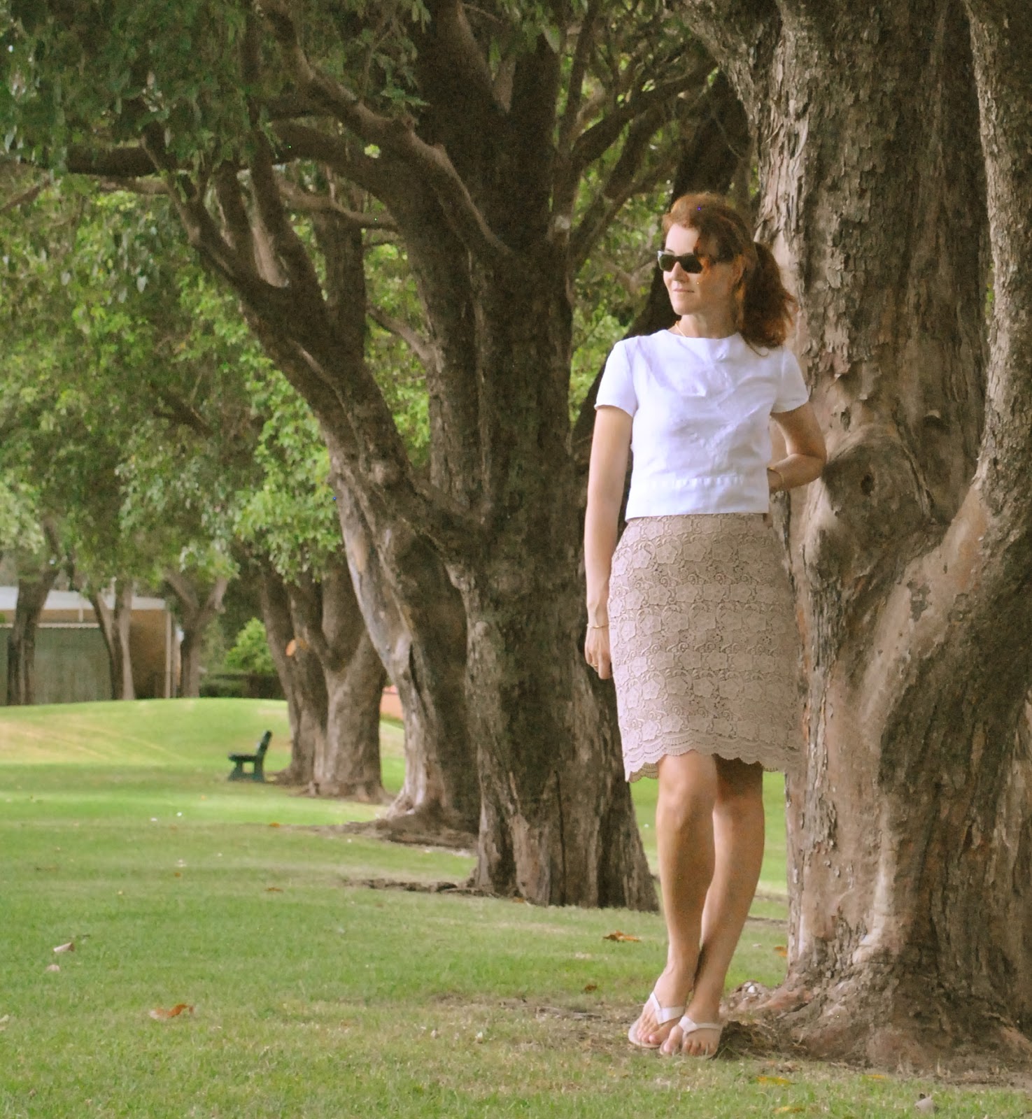 D’ya want to hear/see something funny?  This will give everyone a laugh…. I actually made this skirt back in January of this year, specifically for my high school reunion! and wore it, and photographed it on that day for the blog, but I never put the photo up here…  I decided I just looked silly.  Now I’ve decided that it’s not toooo bad, so here it is!  I made the skirt because I got this whacky idea in my head to kinda reproduce my old school uniform for the reunion.  I found my old school tie, which is tiny! and wore it.  The other pieces are from my regular handmade wardrobe, but it was such a hot night that I left that blazer in the car…