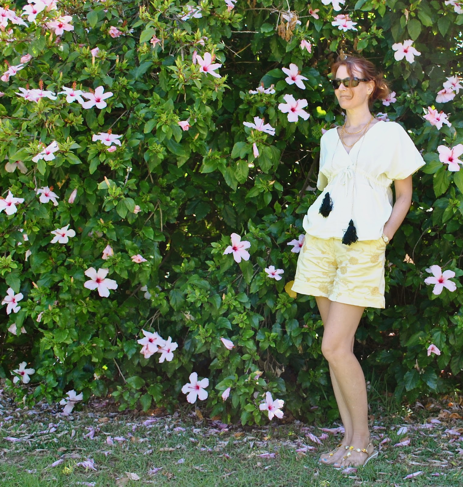 Shorts; Burda 7723 modified, of yellow embroidered cotton, details here, and my review of this pattern here