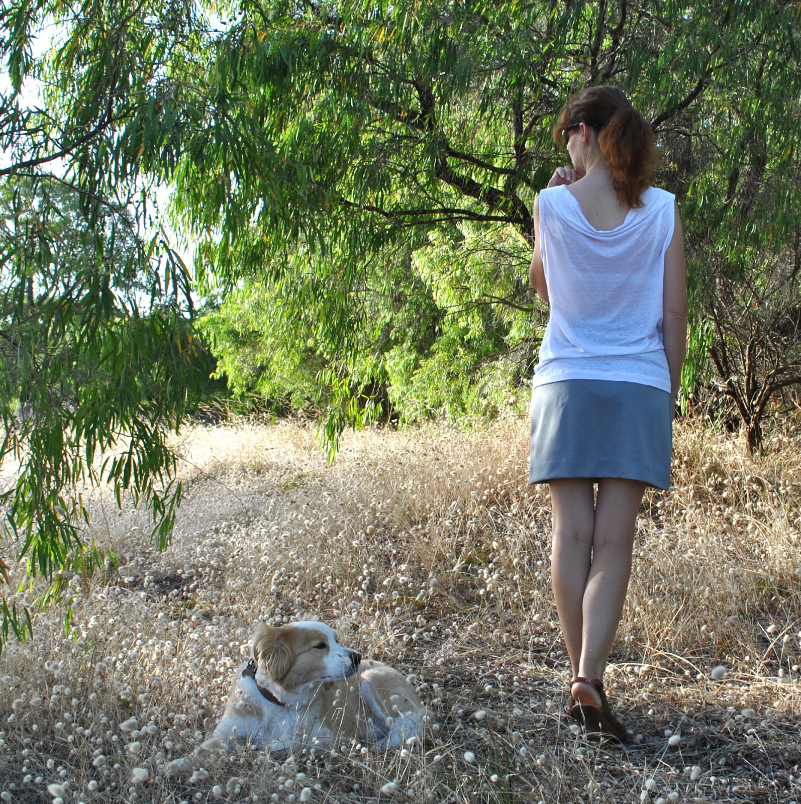 I have made a new top and a new skirt!  and am combining the two new garments in one post; since they kinda go together so well and all, and actually the skirt is so… well, bland and basic that frankly it doesn’t deserve its own post. My top is a modified version of the loose drape top, pattern no. 1 from drape drape, by Hisako Sato.  I used a soft slightly crinkly white cotton jersey, bought from the Fabric Store in Melbourne during my most recent trip.  Regarding the design; I really loved those lovely soft drapes of that front and back neckline, however, like JenC noted in a comment, this top made up as per the pattern is a … er, raaaather revealing garment.  As in, very very revealing.  The photographs in the book have been carefully selected, but it’s plain to see that the model is a hair’s breadth away from being topless.  And more, the top would be falling off one’s shoulders, only like, all the time